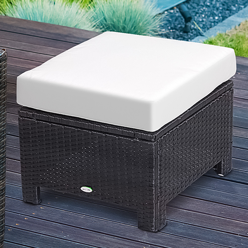 Add comfort, style and functionality to your garden with this Outsunny Black PE Rattan Footstool with Padded Seat. Made using PE wicker, this stool is suitable for outdoor use all year and is resistant to mild weathering. Comfortable and durable, the metal frame creates a sturdy structure and the soft top cushion offers plenty of comfort. Also, the thick top seat has a water-resistant cover to protect against light weathering. Plus, you can remove and wash it anytime you feel it looks dirty. So, whether you are using it as extra seating or just to put your feet up, this ottoman will be a great addition to your garden and home. Size: 50 x 50 x 35cm.