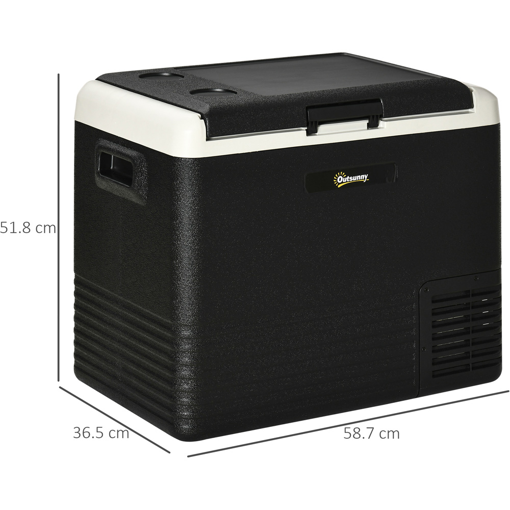Keep your snacks and drinks chilled with this Outsunny Black Portable Electric Car Refrigerator. This 50-litre refrigerator is perfect for use while spending a day at the beach, camping or enjoying a nice picnic outside. The travel fridge and freezer can be plugged in and taken with you anywhere to maintain an ice cold down to -20℃. It comes with a digital temperature display that lets you dial in the electric thermostat on the go, and you can also use it to match your specific needs quickly and easily. This fridge and freezer are equipped with an LED panel that allows you to adjust the temperature range at any time. You can choose the max mode for fast cooling or the ECO mode for energy saving. Moreover, the portable car refrigerator consumes only 60 watts on average. Plus, it is equipped with 110/240V AC and 12/24V DC adapters, which can be used independently or in the car. When the measured DC voltage is below the cut-off value, the portable fridge will shut off to prevent battery depletion.