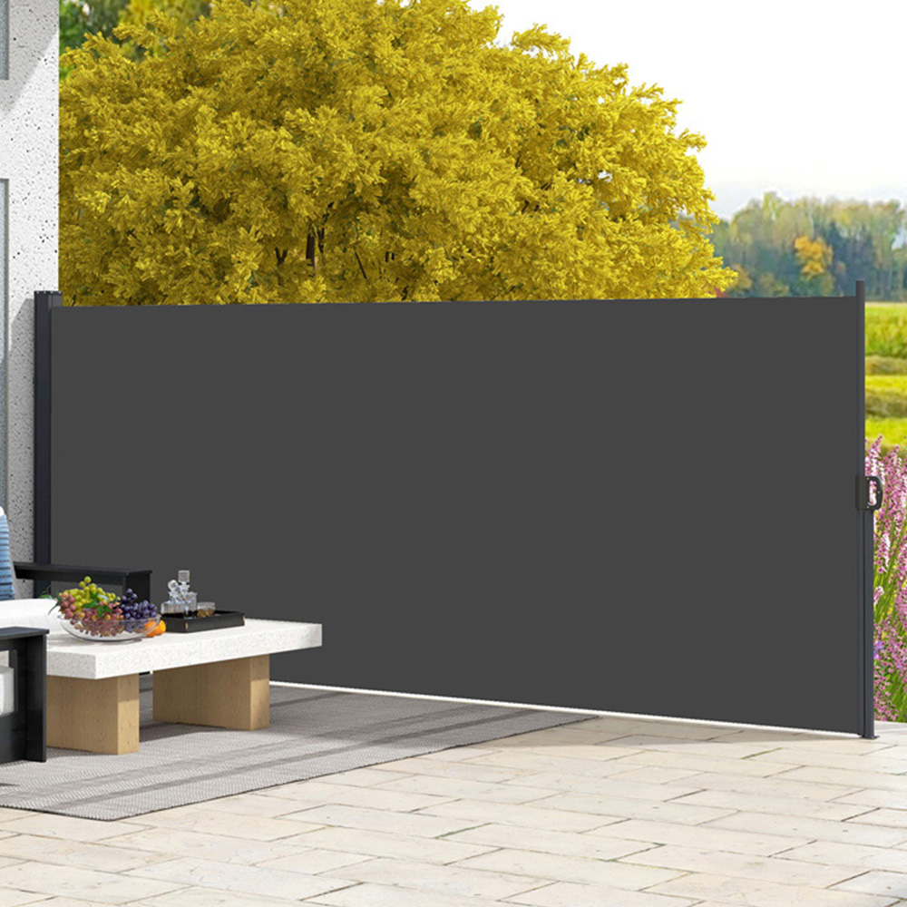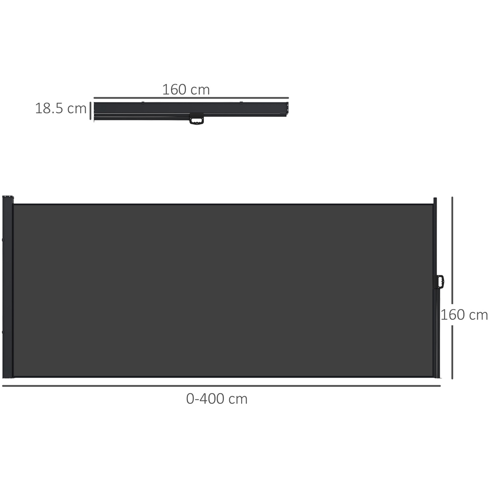 Prevent sun and wind from disturbing your outdoor time with the Outsunny Black Retractable Side Awning. Bring this retractable garden screen into your relaxation space and extend your time out in the garden. With UV30+, this PU-coated polyester screen keeps you protected, providing shade without fading. The metal base frame ensures it attaches securely to the chosen space and holds it strongly in one place. With its retractable design, the screen is flexible and easy to open and retract into position. Simply pull out the canopy smoothly and fix it in place with the clip lock handle. Size: 4 x 1.6m.