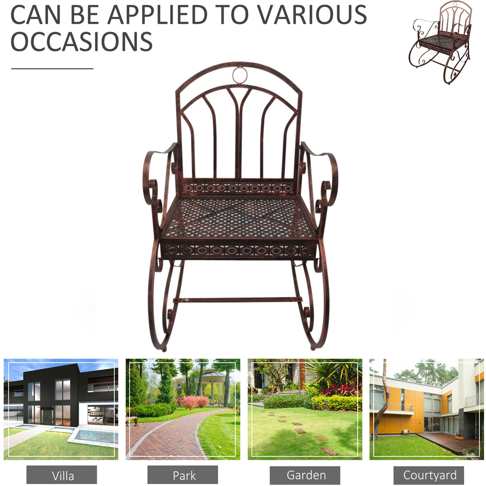 Upgrade your outdoor space with the Outsunny Bronze Vintage Style Rocking Chair. This rocking chair is a great piece of furniture to have in your garden and patio. Made from metal in a bronze finish, it will be a great compliment to any home. This garden chair is stable and durable and can hold up to 150kg. It is a single-seater with a rocking function and comes with armrests, making it comfortable while you enjoy the sunshine. Protect your garden furniture with our durable and waterproof covers. Explore our wide range of heavy-duty Garden Furniture covers to find the perfect fit for your needs.