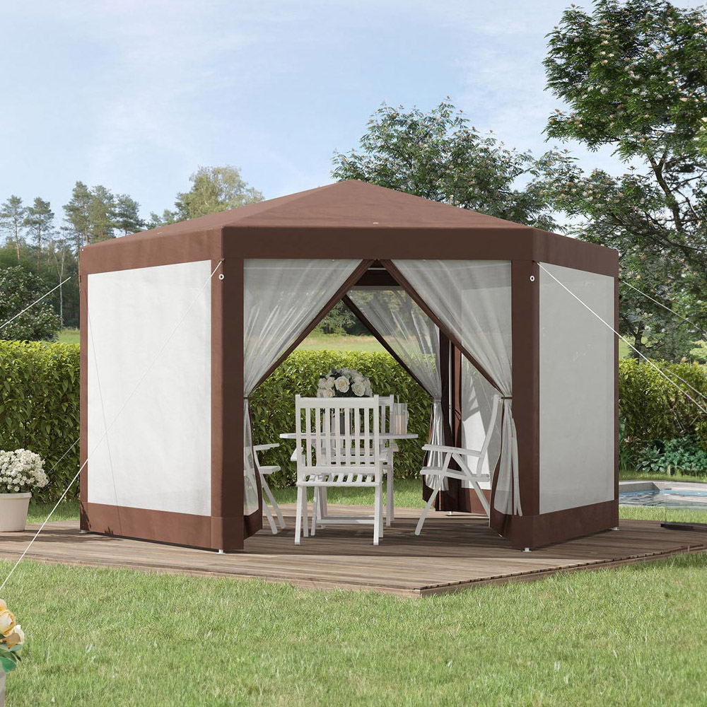 This Outsunny Hexagonal Gazebo in Brown is stylish and easy to set up. It is ideal for family parties, weddings, picnics, sports events, outdoor vendors and camping trips. Sturdy and durable, it consists of a quality steel structure in a white powder-coated finish. The gazebo with a cathedral-style roof is designed to add class to your garden appeal and provide you and your family with a shaded relaxing place. Plus, its mesh walls offer an easy way to create privacy while letting fresh air in and out. They also protect the inside from insects while the two zip doors offer easy access.