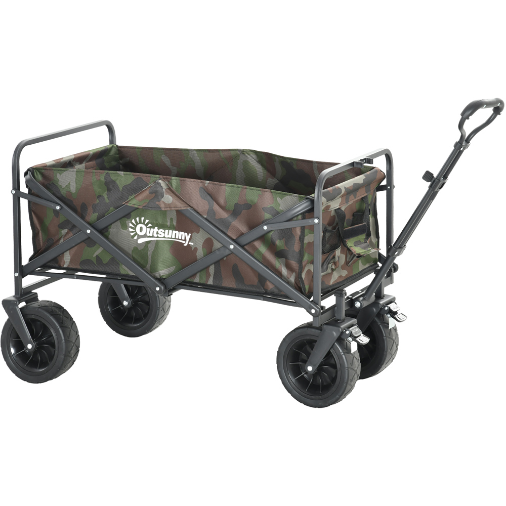 Cut slack on multiple garden trips with this Outsunny Camouflage Folding Garden Trolley. With a weight capacity of up to 100kg, this trolley holds various tools to make your overall gardening experience simple. Crafted with steel, it has a strong, supportive core with two orientation wheels and two 360° wheels to move it smoothly over the ground. This trolley is a must-have for outdoor trips, simply take plenty in this grocery cart to save time, effort and energy. Boasting a foldable design, the cart comes with a carry bag which fits in the boor of your car effortlessly. Also, it has a strong structure which keeps it in shape for peace of mind while on the go.