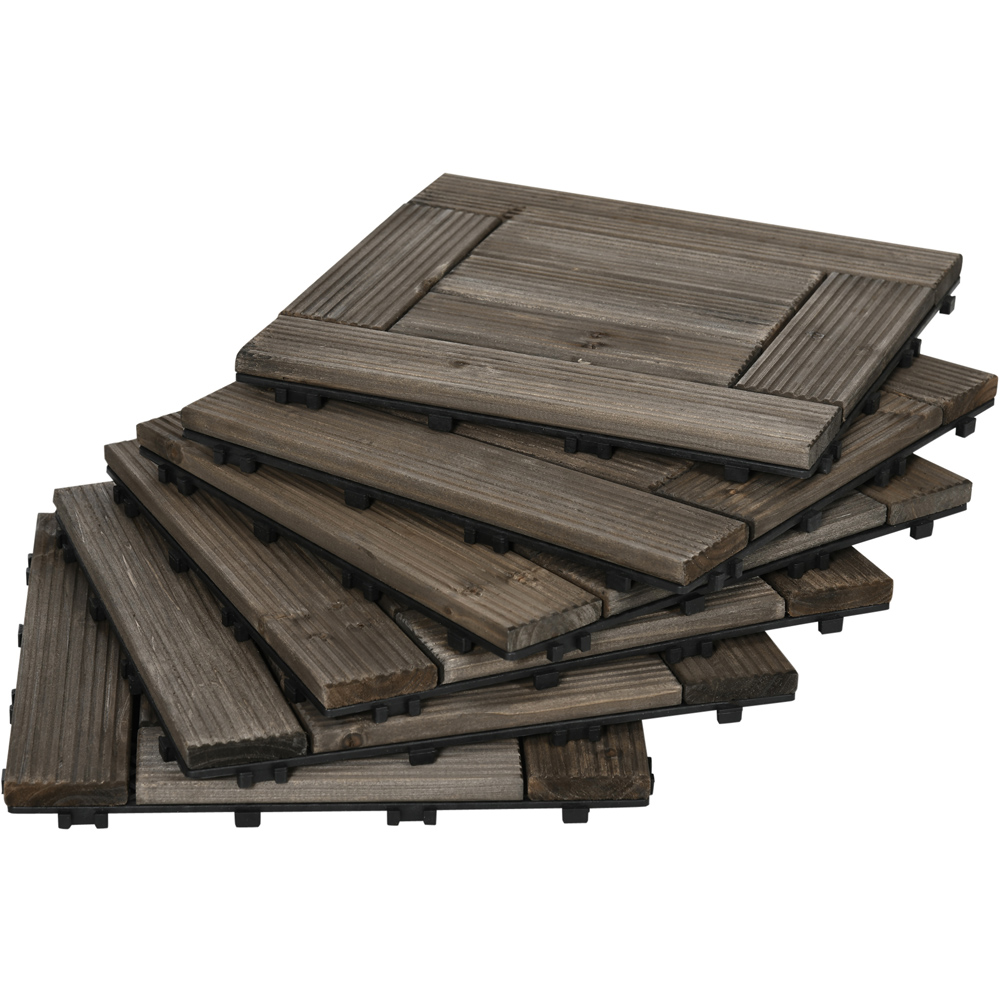 Uplift your patio with this Wooden Interlocking Deck Tiles by Outsunny. This charcoal grey tile pack is designed to transform your flooring instantly. When fitted together, they'll meet the demands of the floor, no matter if they are in a back garden space, a balcony area, a patio and beyond. Each piece is made from solid wood for wearability, with PVC bottoms for slip resistance and resistance to swelling, decay and fading. This decking flooring set includes 27 pieces to cover 2.5㎡ square feet, and you can measure the area to order your tiles. The interlocking design makes it hassle-free to set up and take down; these garden tiles do not require any tools to fit into place. Click into place and enhance the look of your deck, patio or other outdoor spaces.