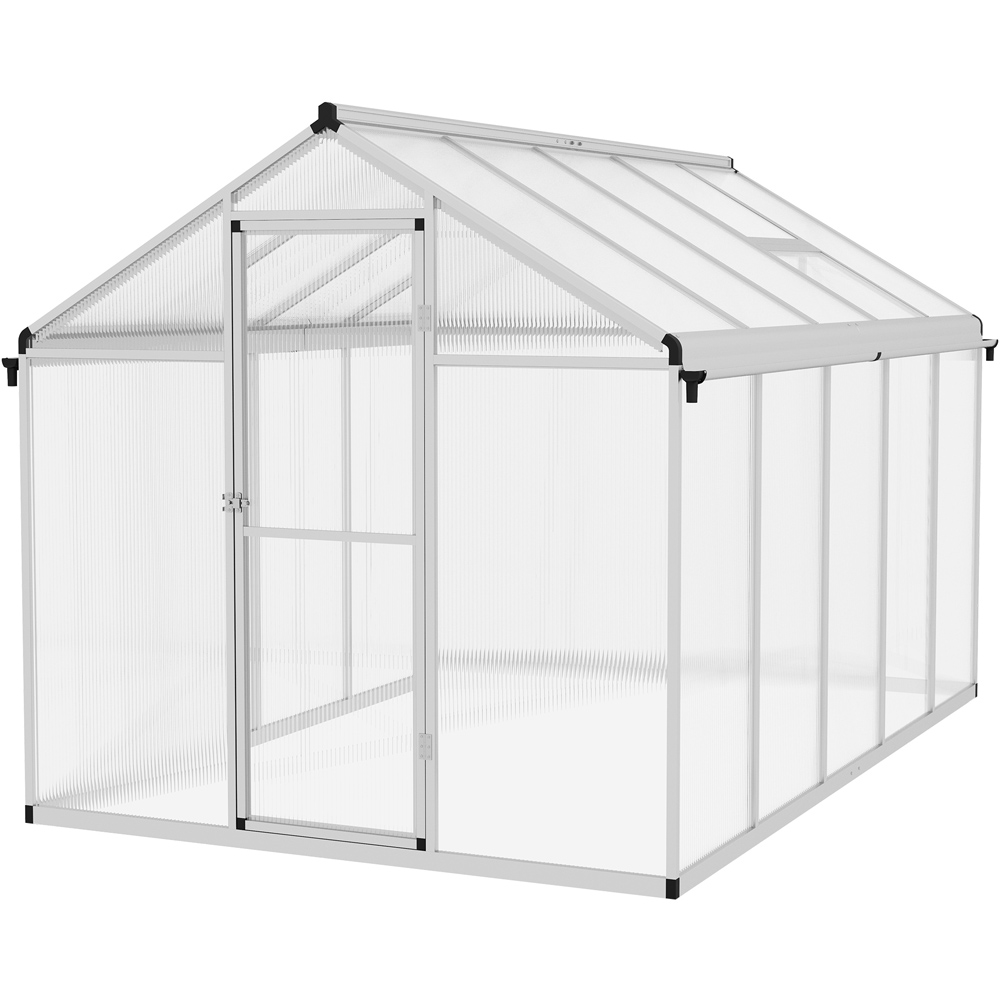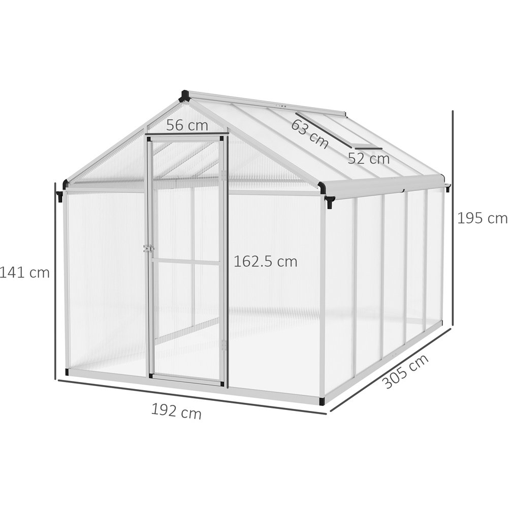 Grow and nurture your plants all year round in this Outsunny Clear Polycarbonate Walk-In Greenhouse. Spacious and sturdy, this greenhouse is made using lightweight yet reliable aluminium and the frame is fitted with rust-resistant hardware and reinforced poles to maintain the structure. Also, the twin wall polycarbonate panels offer a secure enclosure which effectively allows light to seep inside - ideal for rainy seasons. For added convenience, the greenhouse comes with rain gutters on the bottom of the tilted roof to collect water to prevent stagnation and send it back to the ground to keep the surrounding grass hydrated. Size: 6 x 10ft.