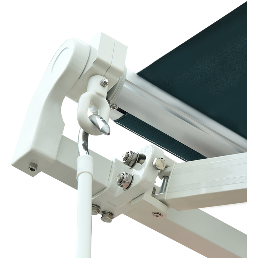 Enjoy your summer with this Dark Green Manual Retractable Awning 3 x 2.5m from Outsunny. This thick, sun-shielding canopy is fixed on an aluminium frame, giving you all the shade you need this season. It is made of 280 g/㎡ polyester with a PU water-resistant coating. This retractable awning protects your home from harsh sunlight and damage from UV rays. Its manual design allows you to set it up wherever needed; whether above a door or window, it can easily be mounted onto your chosen surface with all accessories included in the package. Finished with a crank handle for easy operation, it offers you the time to enjoy the beauty of the outdoors more than ever before. The awning angle can be adjusted horizontally between 5° and 45°, and the width can be adjusted smoothly and quietly via the hand crank, making it easy to meet your sun or shade needs.