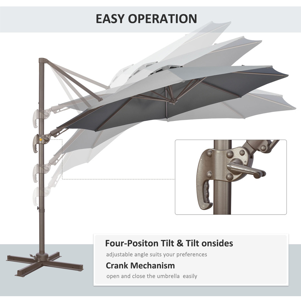 Add practicality to your outdoor space with this Outsunny Dark Grey 8 Ribs Cantilever Parasol. This garden parasol with base is a great solution for your outdoor living. Featuring a 3 x 2.5m canopy, the cantilever can cover a huge area, providing enough shade from the sun. Easy to use, you can adjust the angle and open or close the umbrella using the crank handle. Also, the umbrella can be angled in four different positions, and you can swivel it for correct positioning. Plus, with a cross base and a foot pedal to control the rotation of the canopy, the base offers a 360-degree rotation for easier shading area control. This garden parasol is suitable for use in any park, garden, patio, backyard, beach, pool or other outdoor setting. Note: Only a cross base is included, no counterweight base. Looking for a way to keep your parasol secure and protected and enjoy some shade? Check out our selection of