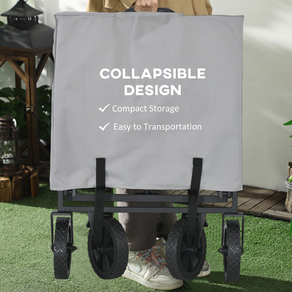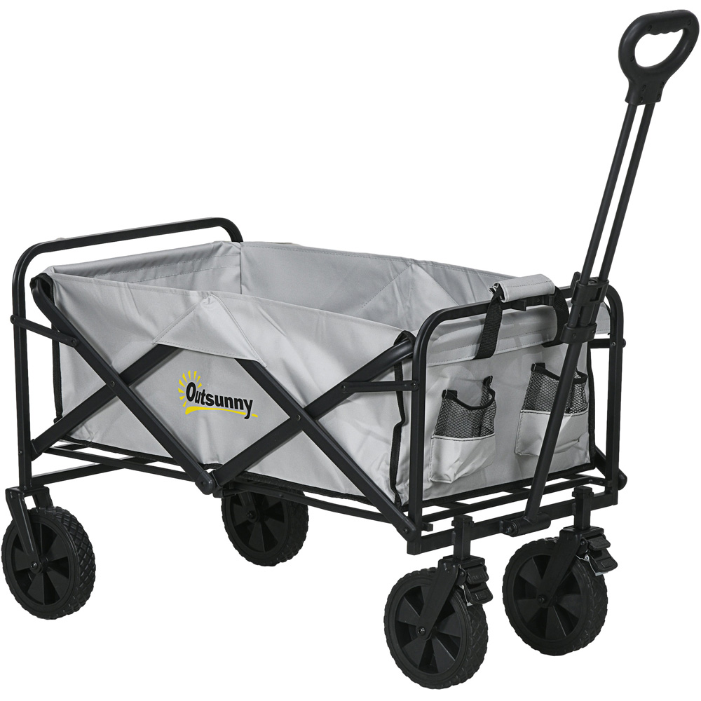 Make hassle-free trips with the Outsunny Dark Grey Folding Beach Trolley Cart. This spacious trolley features a large main cart for moving plenty of items, complemented by a convenient side outer pocket for quick access to essentials. When not in use, simply fold for compact storage. Equipped with a telescopic pull handle and cup holder, this trolley offers convenience on the go. With a sturdy steel frame and two wheels with 360-degree movement, it can navigate a variety of terrains.