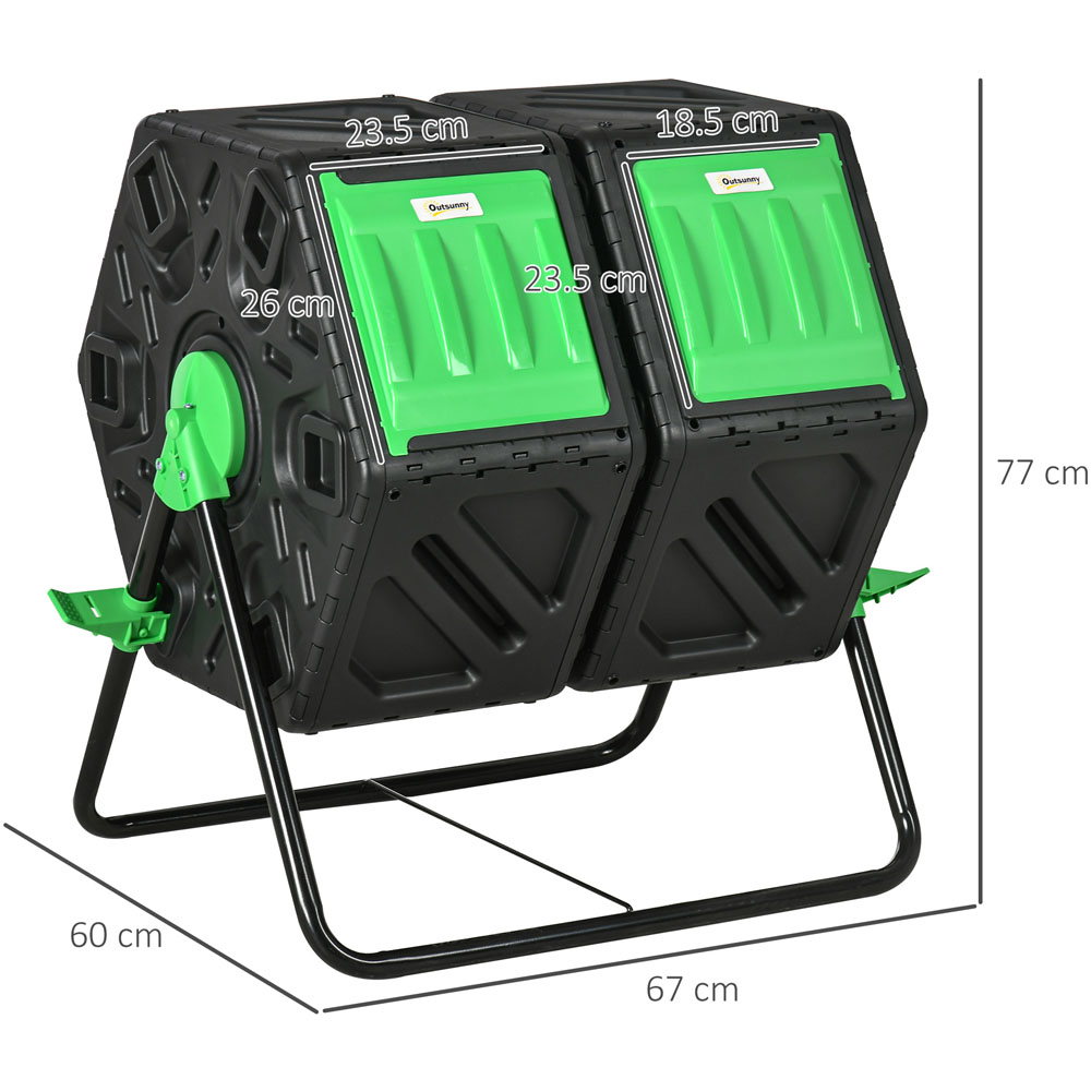 Provide your plants with key nutrients for healthy growth with Outsunny Dual Chamber Garden Compost Bin. Perishable foods can now be put to good use, giving your plants nutrient-package compost for beautiful growth. Great for light use, this garden compost bin will give you rich fertiliser for one-three months. Simply fill this 130L compost maker with waste and wait between one and three months. Featuring 24 ventilation holes - it allows plenty of air inside this rotating composter, helping with the decomposition process. It features two chambers, so you can get double the amount of work done, with no hassle. With the 360-degree tumbling design, you can easily turn this compost bin, mixing the inside contents without having to touch the inside. Assembly required. Specifications: Colour: green and black, Material: Steel, PP, Overall Dimensions: 60L x 49W x 77H cm, Chamber Door Size: 18.5W x 23.5Hcm.
