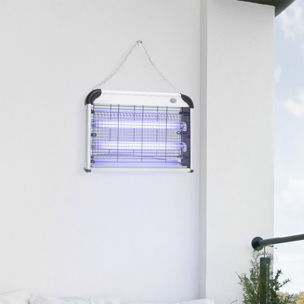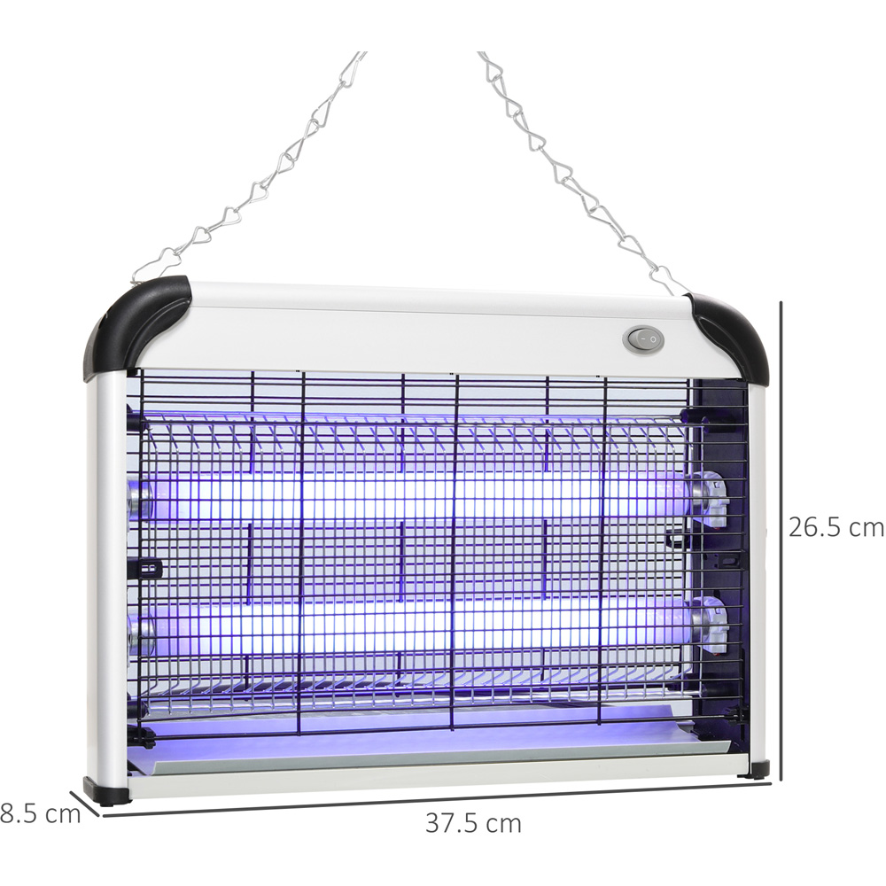 Keep the fly away from your space with Outsunny Electric Fly Killer 20W. This portable bug-killer lamp is energy-efficient, non-radiative, noiseless and odourless. It protects you against mosquitoes, flies and other pests. The front protective screen protects you from touching the inside, avoiding accidental electric shocks. The removable collection tray makes cleaning easy. Mount it on the wall, or hang it with the included chain. It features 20W power and 60-room coverage.