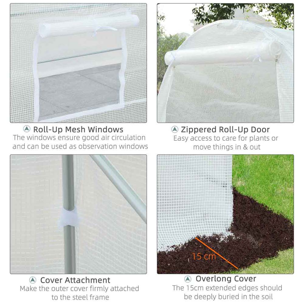 Extend the growing season of your plants with Outsunny Large Garden Polytunnel Greenhouse. It features a durable polyethene covering with grid threading and a sturdy galvanised steel tube frame. The large double zippered door makes for very easy getting in and out of this greenhouse outdoor - it also comes with six ventilation windows. The fully closed UV protection PE cover maintains high humidity levels for growing tropical plants and allows nourishing sunlight to pass through. The 15 cm extended edges are supposed to be deeply buried in the soil to tighten the tunnel greenhouse cover for more stability. Size: 4.5 x 2 x 2m.
