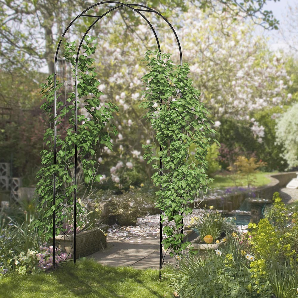 Let nature take centre stage in its own unique way with these arbours for the garden from Outsunny. Standing tall at 230 x 114cm, the metal garden trellis is made into a smoothly curved pellet-shaped design. On the top, there are several bars which allow you to hang baskets for an extra addition of flowers and plants. An easy way to bring natural beauty to your outdoors, whether the corner arbours for the garden be a permanent addition or temporarily for parties, weddings and BBQs. This elegant garden arch creates a beautiful and totally unique spot in your garden. The tall pellet-shaped design of the metal garden arch can fit over and above many things. The side trellis of this garden archway allows vines and plants to grow around with support. It has hanging bars on the top for you to hang extra plants and flowers. The metal frame is tough and sturdy, with a powder coating for extra strength and resilience outdoors. The disc feet provide balance to the arch, with holes to connect the rose arch to the ground with the metal stakes included, keeping it firmly in place on grass or solid surfaces.