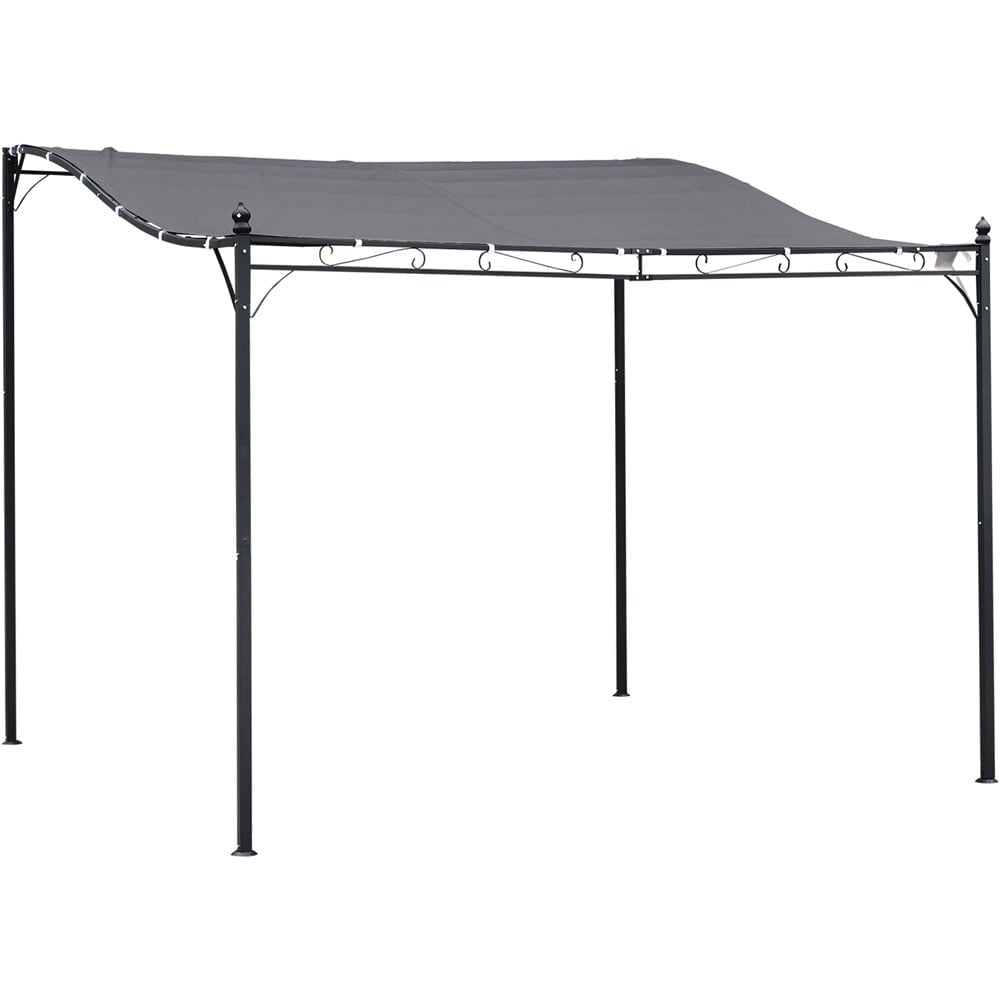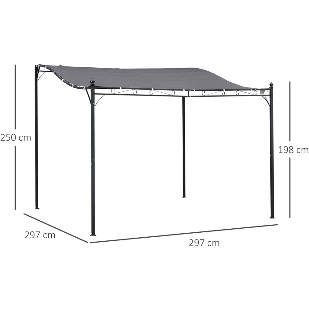 Enjoy outdoor gatherings with your loved ones with the Outsunny Garden Gazebo Awning. It is crafted into a 250 x 297cm design, consisting of a taller back and short front. With a, waved connecting frame covered with a top 180gsm polyester canopy - it provides shelter against direct sunlight. The elegant scroll design on the front and the wall-mounted canopy are finished with 16 drainage holes on the top to prevent water accumulation and eight ground stakes to pin to the ground.