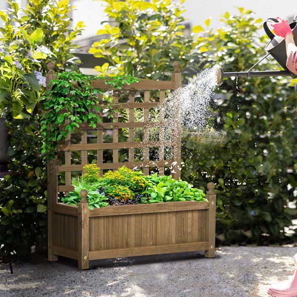 Like flowers and plants but don't have enough space at home? There is no place for the vines? Choose this Garden Planter from Outsunny, which can fully show your potted plants and hang the vines. Featuring a 2-in-1 design, the decorative garden planter with a built-in trellis is suitable for planting flowers and vegetables or vine plants. The beautiful vine plants can be fully displayed on the trellis. Not only a flowerbed but also a display shelf. It has two leakage holes on the raised garden bed's bottom are convenient for drainage, avoiding the trouble caused by accumulated water. With a sturdy solid fir wood construction, this freestanding planter box is suitable as a divider and privacy screen and it can be placed in your home, corner, garden, balcony etc. You can choose to keep the natural finish as it is or customise it to your liking. Assembly is required. Overall Dimensions: H75 x W64 x D28cm. Internal Planting Dimension: H16 x W57.5 x D21.5cm. Grid Frame Dimension: H53 x W64cm. Leakage Holes Dimension: Diameter: 2cm. Weight Capacity: 50kg.