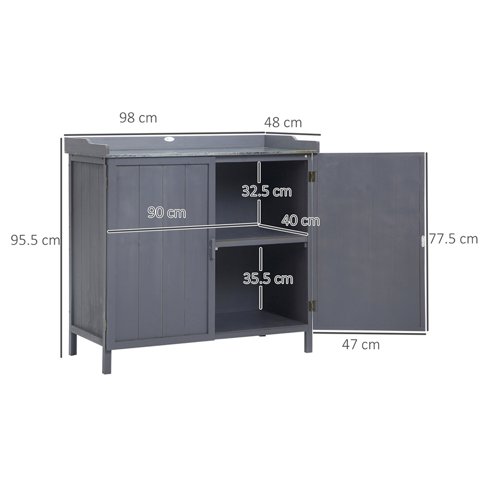 Keep your gardening tools in an orderly fashion with Outsunny Garden Storage Cabinet. This generously-sized storage space and solid galvanised metal worktop come with a 2-in-1 design that allows the shed to be used as a tool cabinet or a potting table. The freestanding design means you can use this practically anywhere you want. It is tough, rust-resistant and a solid place to work on plants and flowers and more. Easy to wipe clean from dirt and other mess.