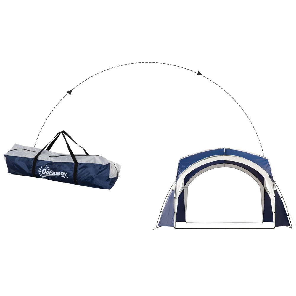 Enjoy the outdoors all year round with this Grey Dome Gazebo Camping Tent from Outsunny. Measuring, 3.5 x 3.5m size, it is spacious enough to fit plenty of friends and family under, with the open side designs allowing extra space to spill out if needed, as well as providing plenty of air circulation all day and night long. It comes with 12 ground pegs and four guy ropes to hold it firmly into the ground. The PU-coated polyester is durable and protects against light UV, rain and wind where possible, while the sides keep air circulated and allow space for people to spill out if required. The top inner hook is great for hanging a lantern at night. You can take it in the included bag to BBQs, picnics, outdoor events and more.