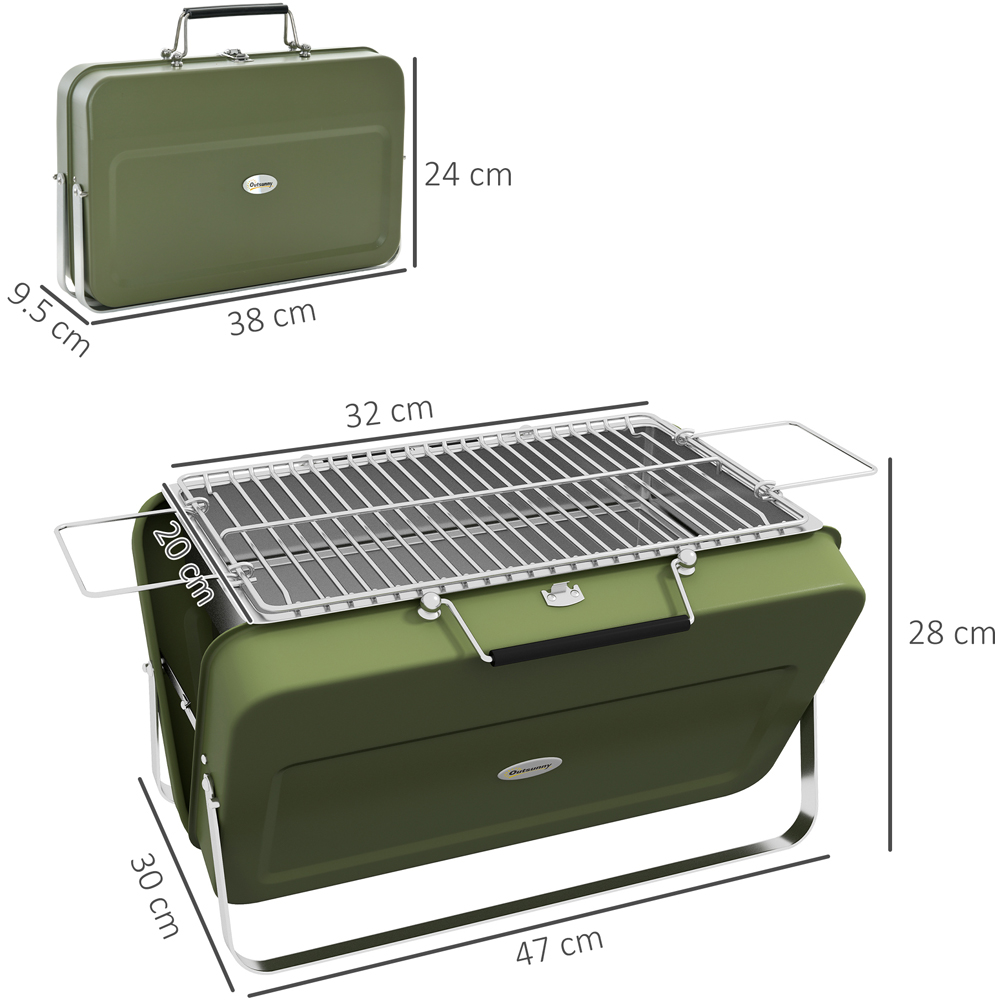 Enjoy outdoor cooking adventures with the green Outsunny mini charcoal grill. With its compact and stylish design resembling a suitcase, this mini barbecue stands out from the rest. Its unique design allows it to fold together and be easily carried with the help of handles, making it ideal for various outdoor activities such as visiting friends' gardens, going on trips, enjoying picnics, and exploring other outdoor areas. Setting it up is a breeze, as no tools are required. Whether you want to cook different ingredients or use it as a platform for your camping skillets, this grill provides endless possibilities. Say goodbye to the hassle of outdoor cooking with the Outsunny camping charcoal grill. Once opened, it offers a generous cooking surface measuring 32 x 20cm, perfect for grilling meat, using camping skillets, and much more. Keep your BBQ covered and protected with our range of premium BBQ covers.
