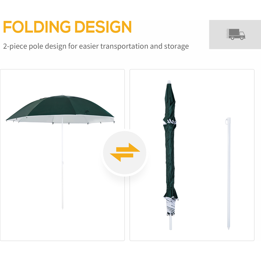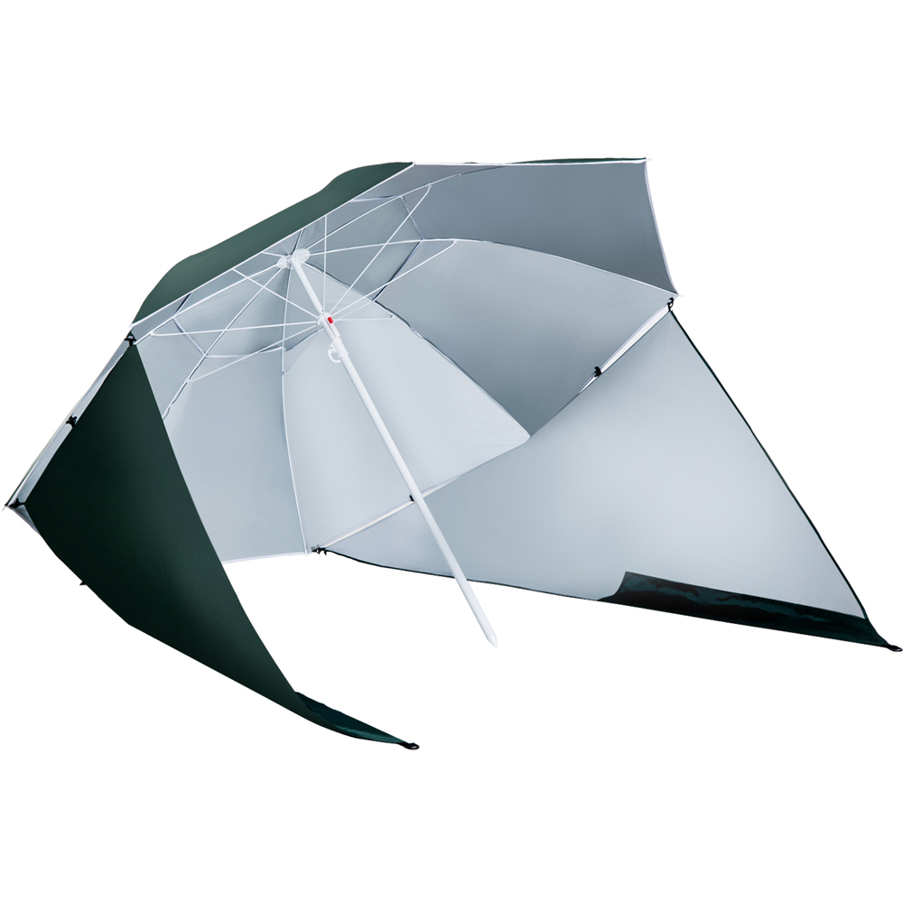 Beat the heat in style with the Outsunny Green Parasol with Curtains. The portable parasol functions as an efficient sun shade with a side covering to keep the wind away, making the beach parasol umbrella the perfect accessory for maximum protection from UV rays. This garden umbrella's polyester fabric has an inner silver coating that provides UPF-50 protection. Patio parasol top with tilt tent and vent for improved ventilation and additional cover. This sun parasol umbrella is a great option because of its telescope pole design and height adjustment feature. Equipped with side curtains to provide better wind, rain, and sun protection. To create the appearance and feel of a traditional outdoor umbrella, simply pull back the curtains as needed. You can secure your umbrella without the use of an umbrella stand thanks to the one D-shaped buckle and two ground pegs that come with this umbrella. Ideal for sandy beaches, parks, and riverbanks. Size: 2m. Looking for a way to keep your parasol secure and protected and enjoy some shade? Check out our selection of