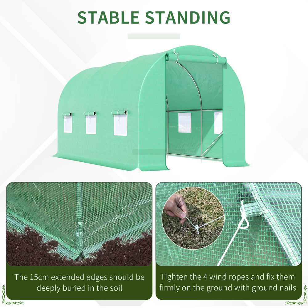 Cultivate a world of possibilities in your backyard oasis with this Outsunny Green Walk In Garden Polytunnel Greenhouse with Roll Up Door and Windows. The spacious walk-in greenhouse is fully open - giving you plenty of room for growing plants and vegetables with space for shelving units. It features a steel frame for a strong standing structure with metal rods for extra support. The garden polytunnel with PE cover is protected inside from mild weather while allowing sunlight and fresh air to pass through to encourage growth. Use the included guy ropes and ground stakes to pin the structure to the ground. The structure is finished with six mesh windows and a large zipped roll-up door. Size: 4.5m x 2m x 2m.