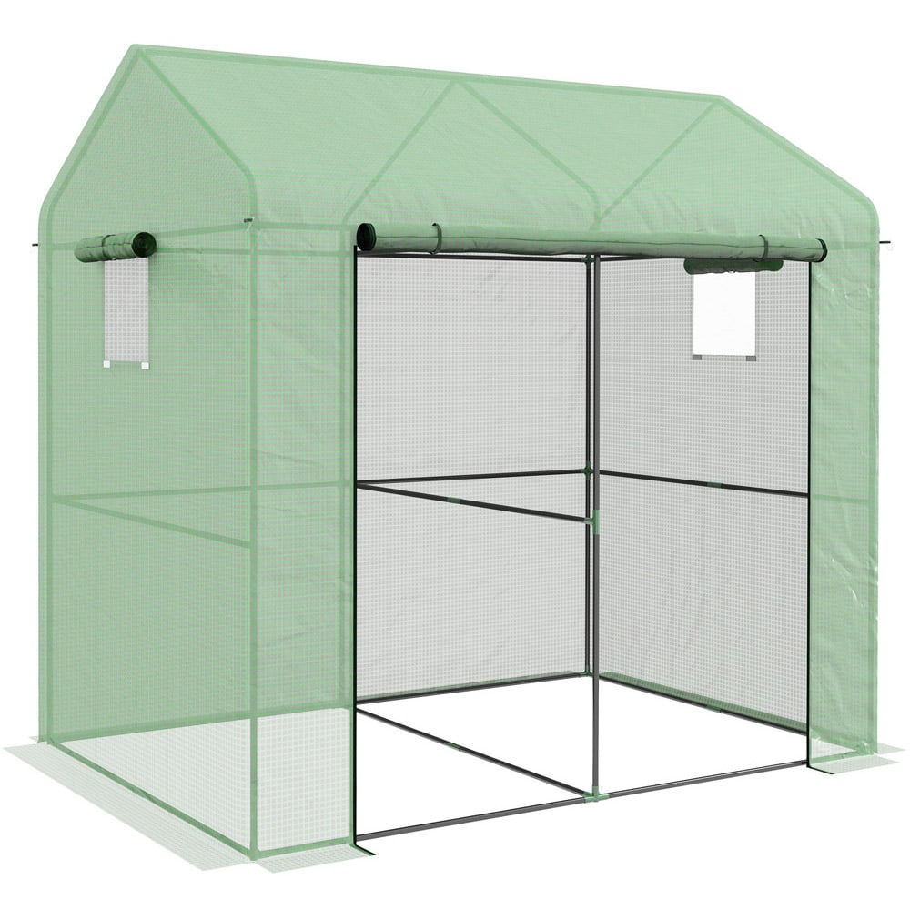 Elevate your gardening experience with the Outsunny Green Plastic Walk-In Greenhouse with Windows. This greenhouse comes in a two-room design, so you can separate plants to how you want. With a steel frame, the core is sturdy, with four guy ropes and four ground stakes included to pin into the ground. Also, the plastic cover creates a protective shield for the inside - plants grow with cover against wind and rain. Plus, the 10cm cover edges are perfect to bury into the soil for extra stability. Easy to access and let air inside - simply roll up the two doors and hold them in place. Plus, the plastic cover acts as a protective shelter for the plants and allows 85% nourishing sunlight to pass through. Size: 6.5 x 4.5 x 6.5ft.