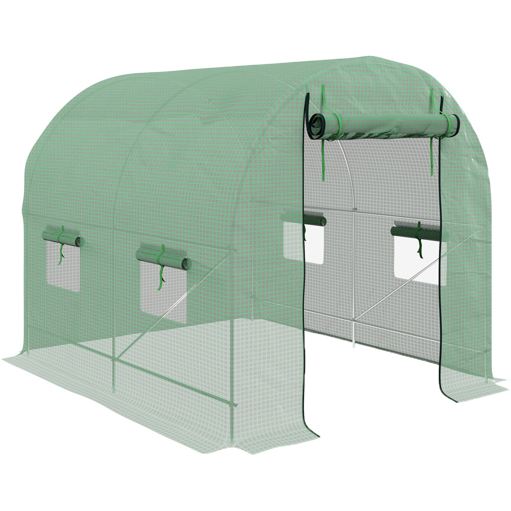 Put up and start growing a garden of greenery with the Outsunny Green Plastic Walk-In Polytunnel Greenhouse with Windows. Featuring a spacious and open inside design, this greenhouse has plenty of room to grow various vegetables, flowers and more. Crafted with a steel frame, it makes a strong standing structure with metal rods for extra support. Easy to install, you can use the included guy ropes and ground stakes to pin the structure to the ground. Also, the greenhouse comes with four mesh windows and a large roll-up door for added convenience. Plus, the plastic cover protects the plants from mild weather while allowing sunlight to pass through to encourage growth. Size: 6.5 x 6.5 x 8.2ft.