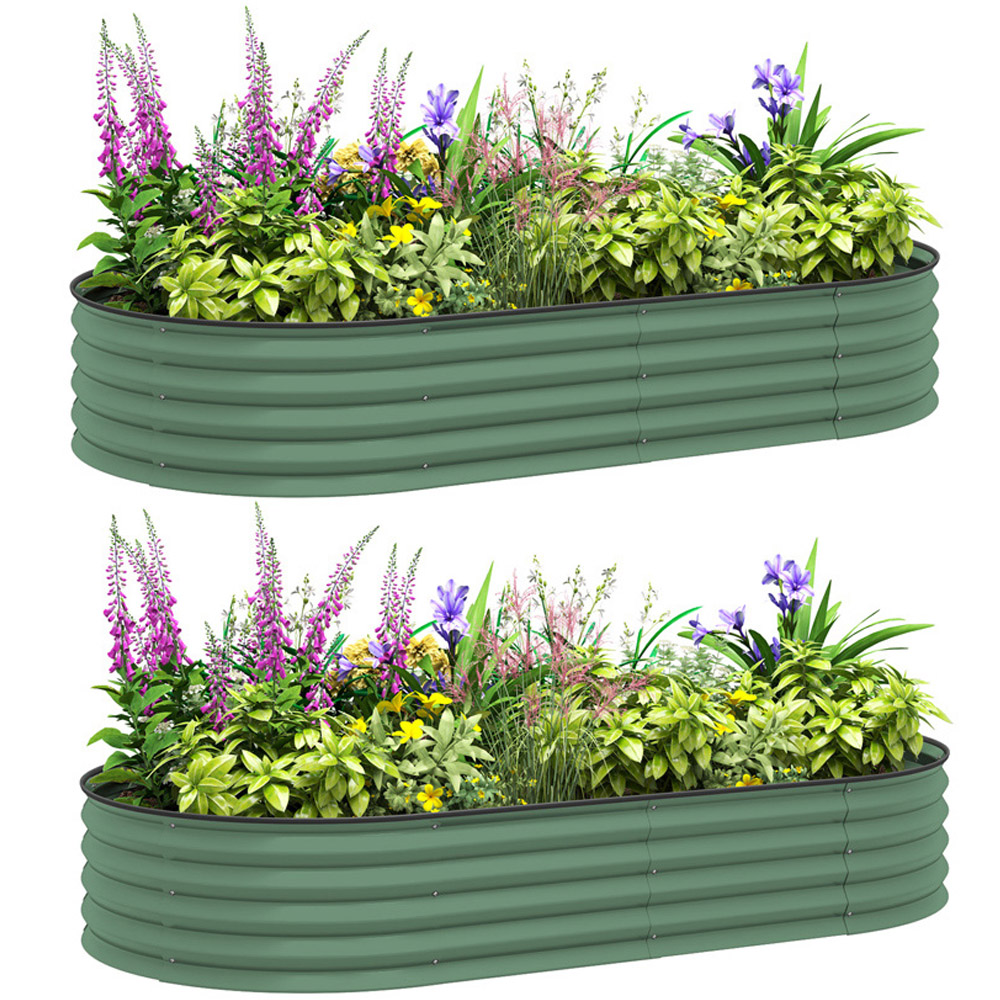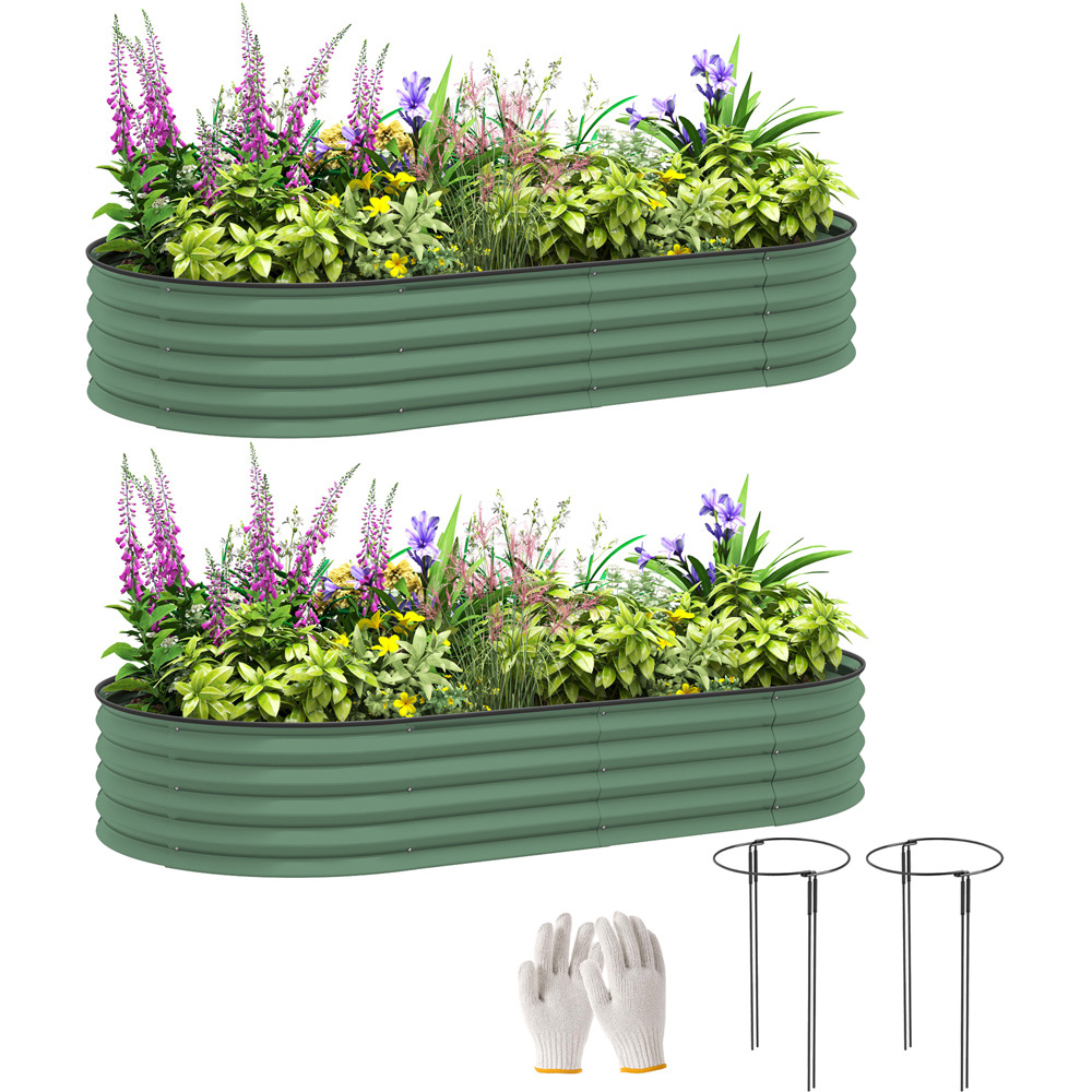 Enhance your garden with the Outsunny Green Raised Garden Bed with Metal Plant Stakes Set of 2. The raw, unpolished design of these raised garden beds makes them a standout addition to any outdoor space. Easy to blend in with natural surroundings, they are perfect for every garden. Made from galvanised steel, these planters are tough and durable. The open-bottom design ensures direct contact with soil for maximum growth and prevents water build-up. The set of two provides double the growing power, allowing you to cultivate a diverse and thriving garden.