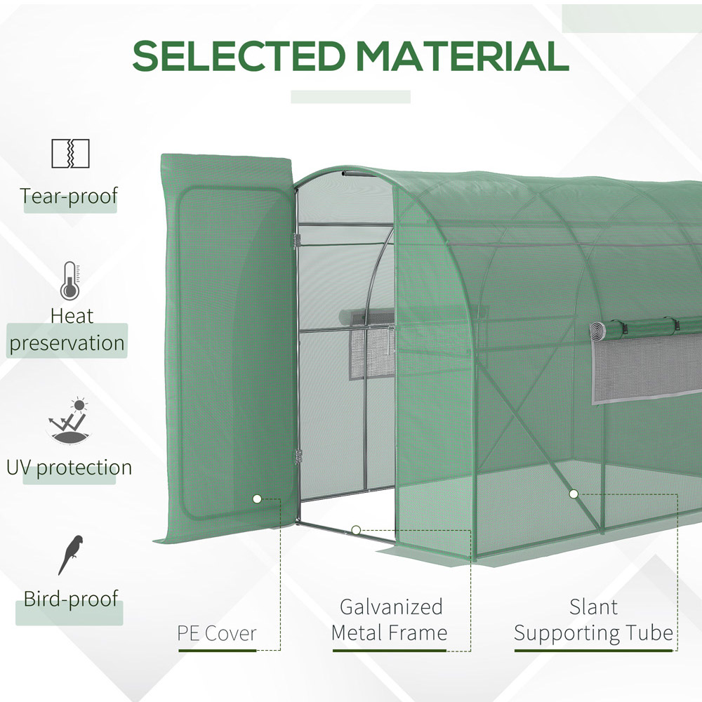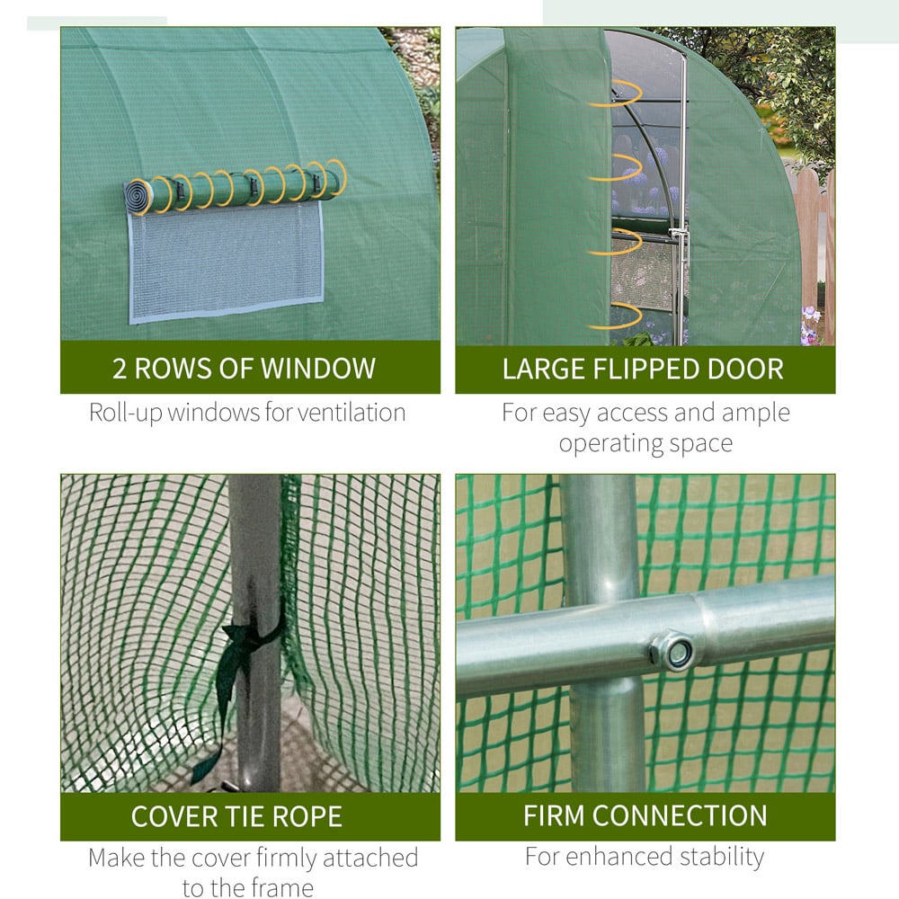 Cultivate a world of possibilities in your backyard oasis with this Outsunny Green Galvanised Steel Walk In Garden Polytunnel Greenhouse with Door and Windows. This 3 x 2m walk-in greenhouse tent is composed of durable PE cloth over a high-quality steel pipe frame. Thanks to solar energy, this polytunnel with doors can maintain consistent temperatures that are ideal for plant growth. The PE cover protects the plants in this plastic greenhouse from light rain and pests. The two windows on either side are suitable for ventilation. This heavy-duty greenhouse is an ideal way to extend your growing season by managing your plants in the polytunnel and protecting them from cold. It features one large opening with an adjustable roll-up window on each side of the tunnel for cross ventilation on hot days and drains away water, reducing pressure on the greenhouse outdoor frame. The waterproof UV-resistant cover maintains high humidity levels for growing tropical plants and allows nourishing sunlight to pass through this large polytunnel.