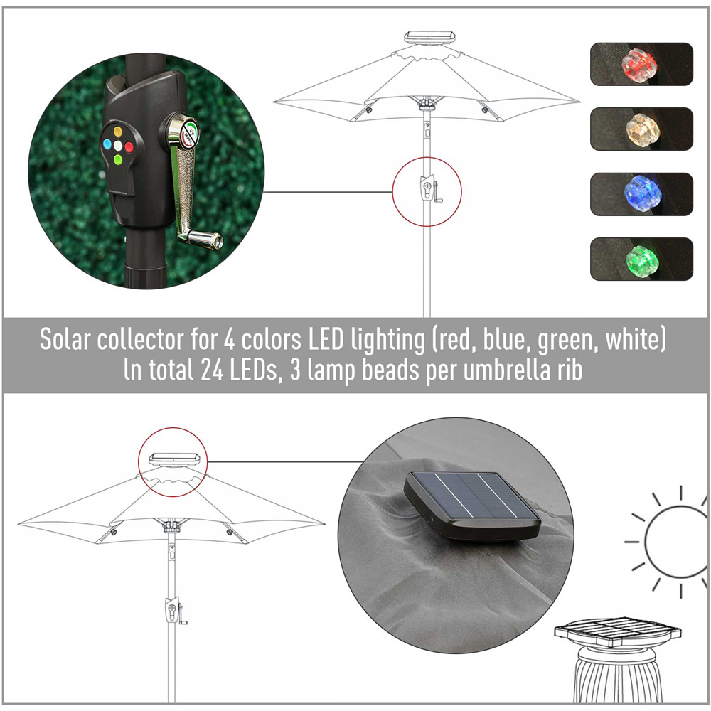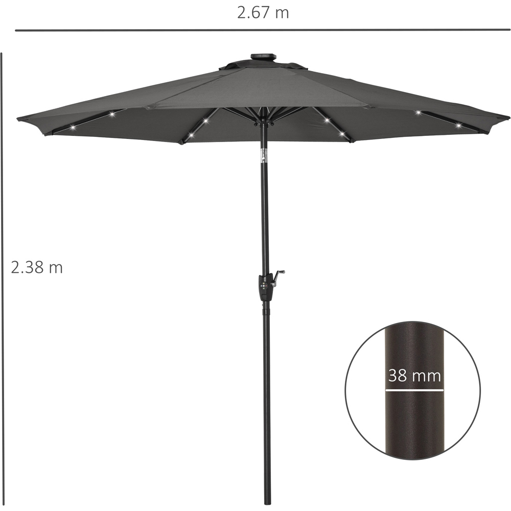 This parasol umbrella from Outsunny is an excellent choice for providing shade on sunny days. Its tilt feature offers better protection and makes it suitable for use in your patio, garden, or with any existing outdoor furniture. The steel structure and polyester fabric provide sturdy support and long-lasting features. The parasol umbrella also comes with solar-powered LED lights that have adjustable colours in red, blue, green, and warm light. With 24 pre-installed LEDs, you get energy-efficient lighting with eight lights per rib of the garden parasol. The tilt design and crank handle allow for easy adjustment and bending of the pole to maximize your shade. The easy open/close system puts the solar parasol up in just seconds with minimal effort. The polyester canopy is 180g/㎡ thick and durable, with a top vent that allows air to escape easily, preventing it from turning inside out. Looking for a way to keep your parasol secure and protected and enjoy some shade? Check out our selection of