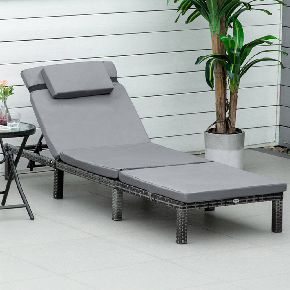 Lounge in luxury, whether in the garden or patio outdoors thanks to this Outsunny Grey 5 Level Adjustable Sun Lounger. Crafted from a powder-coated metal frame with PE wicker wrapped around, this lounger is weather-resistant, durable and beautiful. The back is set to five different positions, so you can choose the angle most comfortable for you. The comfortable longline seat comes with a removable cushion, and the polyester cover can be washed to keep it clean. Style and comfort blended, this lounger is ideal for a patio, pool or garden.