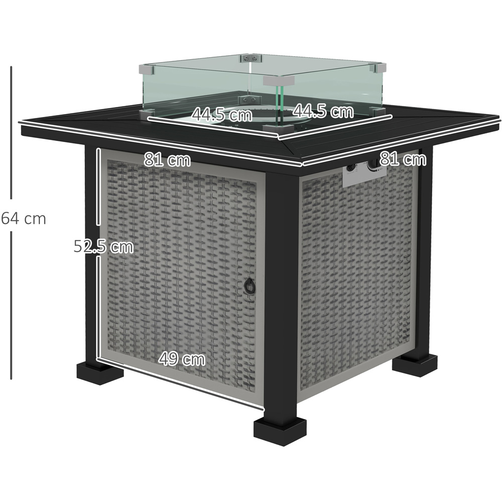 Elevate your outdoor space with the Outsunny Grey 50000 BTU Gas Fire Pit Table with Glass Screen. It features a stylish rattan design and an inner compartment for safe propane gas storage and boasts a 50,000 BTU burner for a clean and smokeless flame. It also doubles as an outdoor dining table, offering functionality and versatility. Plus, the lid allows you to cover the fire pit when in use as a regular table. The pulse ignition system makes starting and adjusting the frame a breeze, and the propane tank is protected and hidden by a door. Please note: The pulse ignition system requires an AAA battery that is not included with the product.