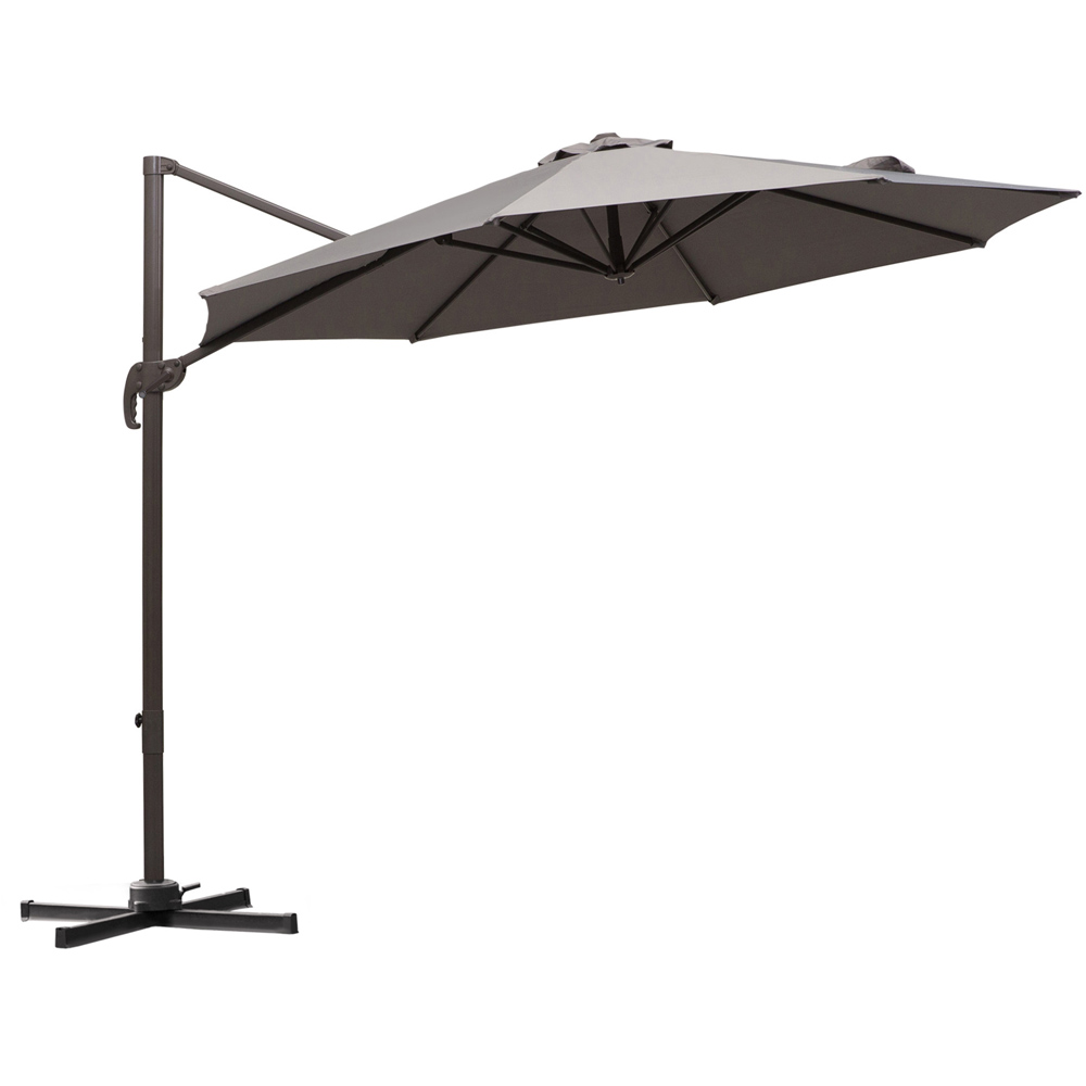 Keep harmful UV rays at bay with this Outsunny Grey Rotating Cantilever Parasol. Durable and sturdy, this parasol is crafted with powder-coated aluminium, and its robust central pole is resistant to rusting, peeling and corrosion. Connected to the frame via eight steel ribs for extra strength, the polyester canopy is easy to clean and does not fade. Easy to use, it features a crank mechanism for simple opening and closing. Made with 180g polyester, this parasol comes with a cross base and protects you from glaring sun, mild rain and wind. Plus, it swivels 360 degrees via the foot pedal to block the sun in any position and keep you protected all day long. Looking for a way to keep your parasol secure and protected and enjoy some shade? Check out our selection of