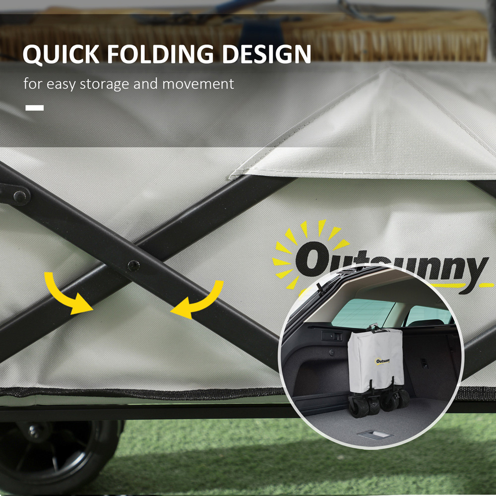 Discover the ultimate in convenience with this Outsunny Grey Folding Beach Trolley Cart, designed to effortlessly transport a large volume of items, making it an excellent companion for camping trips, festivals, and everyday shopping excursions. Featuring a protective overhead canopy, this garden cart ensures that your belongings remain dry and clean, shielding them from rain and dirt. The innovative push or pull handles offer a 7-level adjustable front and an extendable rear handle for easy manoeuvrability from multiple angles. Constructed with a robust steel frame and four wheels, two of which provide 360-degree rotation, this festival trolley glides smoothly over a variety of terrains. With generous dimensions, this cart is ready to meet your hauling needs. Overall Dimension: H98 x W55 x L117cm. Cargo Size: H27 x W44 x L82cm. Adjustable Handle Height: 73-98cm. Folding Size: H84 x W24 x L56cm. Weight Capacity: 68kg. Net Weight: 11.1kg.