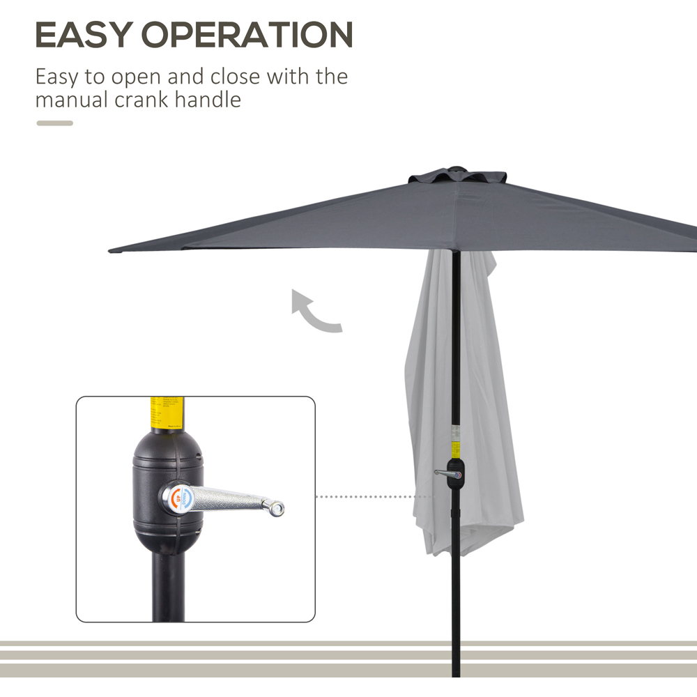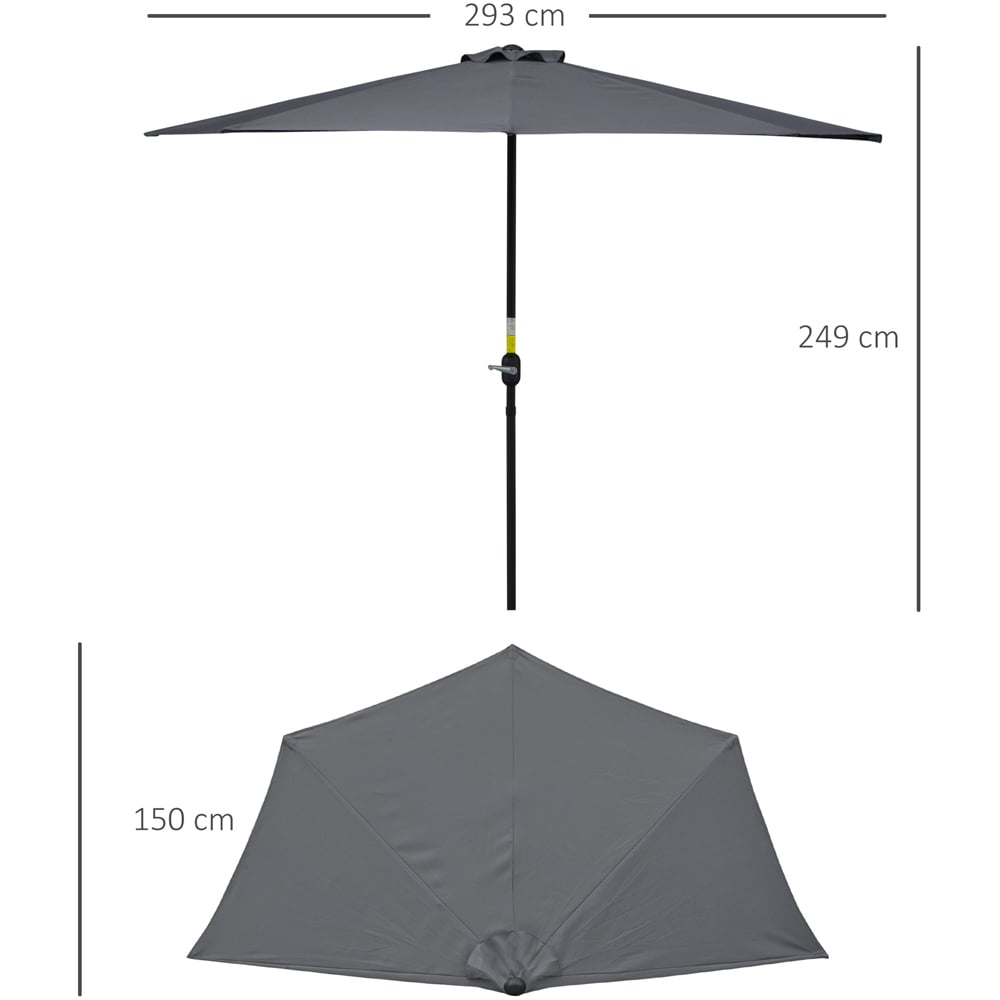 This Half Round Umbrella Parasol from Outsunny is a great addition for anyone who wishes to have a patio umbrella in a limited space. This parasol has been designed to stand against a wall. It features a sturdy metal frame with five ribs that support a UV-resistant half-round polyester canopy. With a crank mechanism, you can open and close the garden parasol in seconds using the easy-to-turn handle located on the side of the parasol pole. The top vent design of this half parasol umbrella provides airflow and reduces the chances of overturning. Colour: Grey. Size: 3m. Looking for a way to keep your parasol secure and protected and enjoy some shade? Check out our selection of parasol bases, designed to keep your parasol in place while you relax and parasol cover to keep them protected.