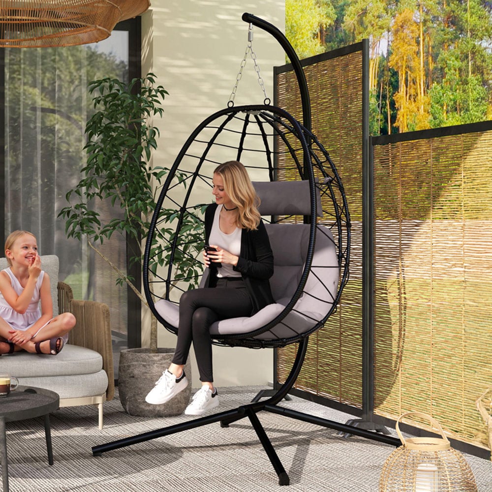 Relax in optimal comfort with this outdoor egg chair from Outsunny! This spacious egg swing chair features a wide seat with a unique hollow-out design, like a breathable and cool bird nest to soothe your heart. PP rope weaving makes it a relaxing place with beautiful visuals indoors and outdoors. Sink into the garden egg chair with a 15cm thick cushion and a 12cm head pillow, both with removable covers for easy cleaning. Grab a book or drink, unwind in peaceful solitude, or soak in the serene sunset. The folding basket allows easy storage. A powder-coated steel frame and X-shape base mean a stable swinging egg chair. Adjustable top chains customise your swinging experience. You can easily fold and store the basket when not in use to protect it. A safety tether keeps the outdoor swing chair steady, ensuring a smooth and relaxing sway every time.
