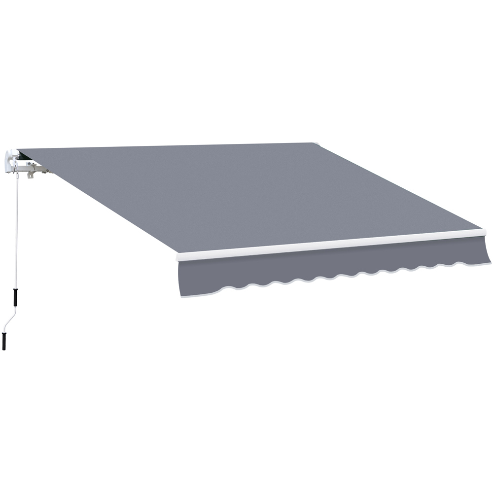 Enjoy your summer with this Grey Manual Retractable Awning Four x Three m from Outsunny. This thick, sun-shielding canopy is fixed on an aluminium frame, giving you all the shade you need this season. It is made of 280 g/㎡ polyester with a PU water-resistant coating. This retractable awning protects your home from harsh sunlight and damage from UV rays. Its manual design allows you to set it up wherever needed; whether above a door or window, it can easily be mounted onto your chosen surface with all accessories included in the package. Finished with a crank handle for easy operation, it offers you the time to enjoy the beauty of the outdoors more than ever before. The awning angle can be adjusted horizontally between 5° and 45°, and the width can be adjusted smoothly and quietly via the hand crank, making it easy to meet your sun or shade needs.