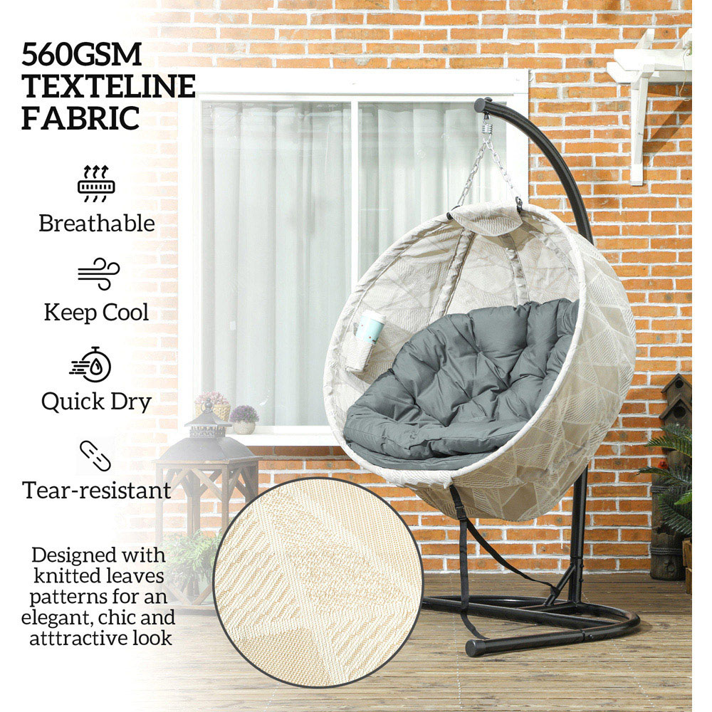 Relax in optimal comfort with this outdoor egg chair from Outsunny! With a wide seat covered in geometric-pattern textilene fabric, this egg garden chair offers cosy, bird-nest-like retreat. The folding basket allows easy storage, with a cup holder keeping your drink close. A large 13 cm thickened cushion and a bottom cushion offer cloud-like comfort. Powder-coated steel frame and U-shaped base mean a stable swinging egg chair. Adjustable top chains customise your swinging experience. Wide seat covered with 560 gsm geometric-pattern text-line is like a breathable and cool bird nest to soothe your heart - a relaxing place with beautiful scenery and nice home decoration. Sink into the garden egg chair with a thickened 13 cm large cushion and a bottom cushion. Grab a book and drink, unwind in peaceful solitude, or enjoy the sunset outdoors. Remove the screws and fold up the basket to store when not in use. Keep a drink in place with a side cup holder. A tether secured to the base reduces movement for a smooth, relaxing swing.