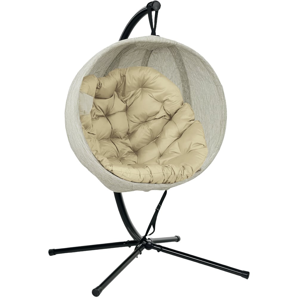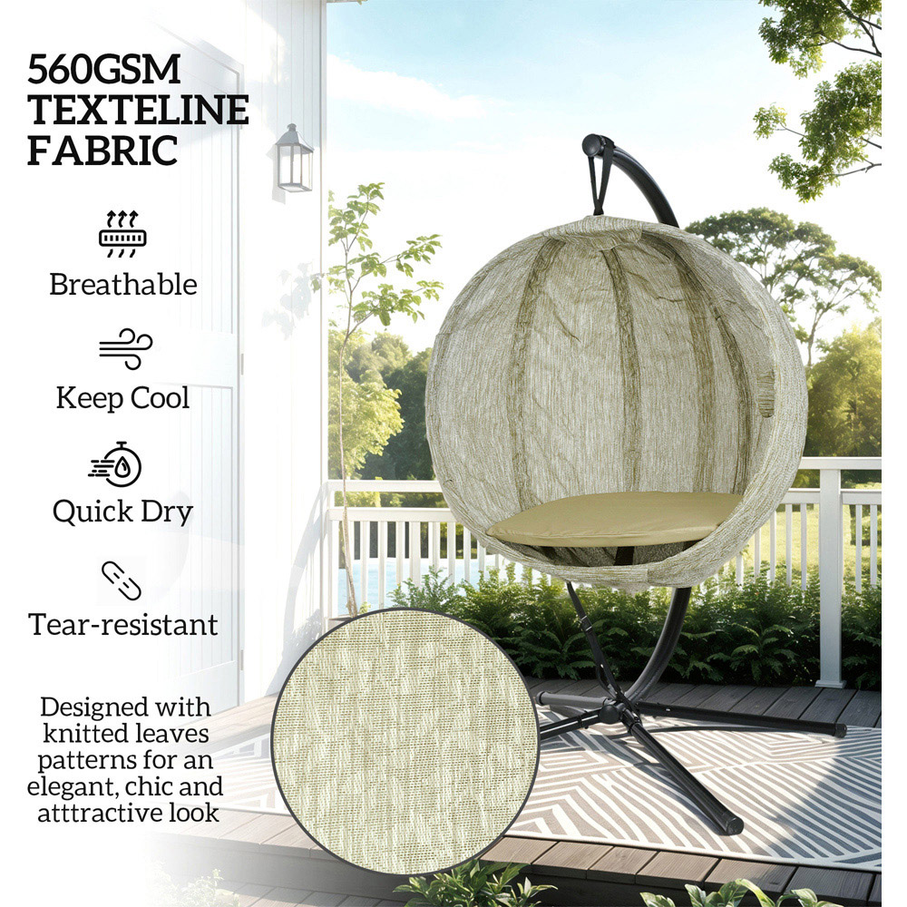 Unwind in stylish comfort with the Outsunny outdoor egg chair! With a wide seat covered in leaves-pattern textilene fabric, this egg garden chair offers cosy, bird-nest-like retreat. Enjoy cloud-like relaxation with a thick 13cm cushion and a bottom cushion. The foldable basket makes storage effortless and a built-in cup holder keeps your drink within easy reach. With a powder-coated steel frame and four-leg base, this swinging egg chair offers stable, lasting support for your outdoor leisure. A wide seat covered with a 560gsm leaves-pattern text line is like a breathable and cool bird nest to soothe your heart - a relaxing place with beautiful scenery and nice home decoration. Sink into the garden egg chair with a thickened 13cm large cushion and a bottom cushion. Grab a book and drink, unwind in peaceful solitude, or enjoy the sunset outdoors. Remove the screws and fold up the basket to store when not in use. Keep a drink in place with a side cup holder. A tether secured to the base reduces movement for a smooth, relaxing swing.