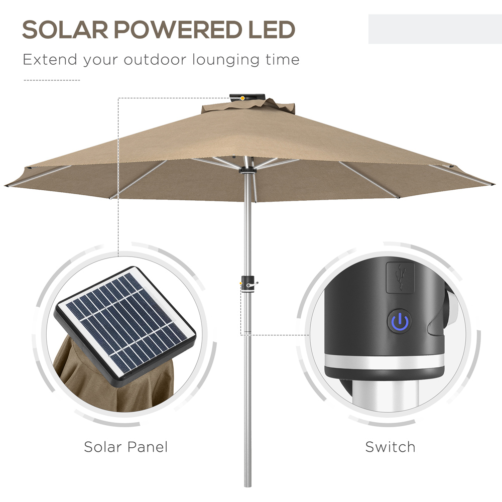 Transform your garden with the Outsunny Khaki Solar Patio Garden Parasol. The integrated lighting extends your evenings with four adjustable light modes, ranging from a soft glow to daylight brilliance, all powered by convenient solar charging. The strong aluminium frame ensures stability, and for added steadiness, use a minimum 25kg weight. The adjustable LED strips allow you to switch between soft, warm, natural, and daylight white lighting. The parasol charges in the sunlight and can also be quickly charged via USB-C in just three hours.
