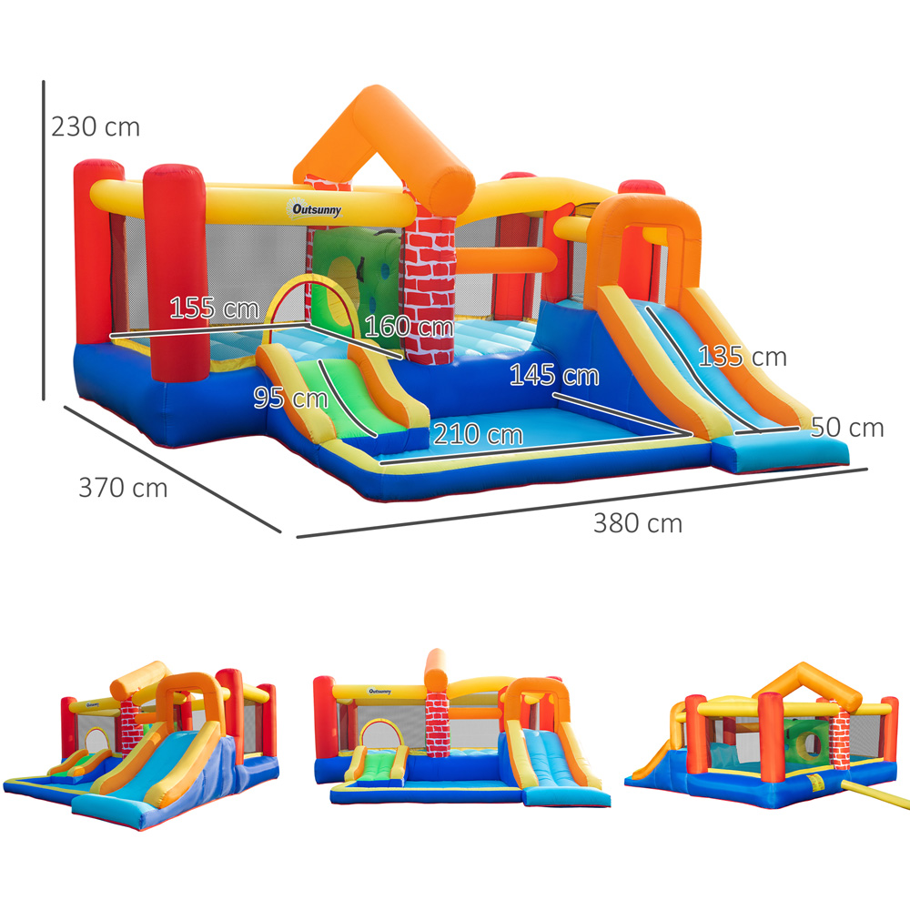 Let your little ones make the most out of the outdoors with this Outsunny Kids Bouncy Castle with Blower. With a great layout and fun design, this bounce house will be the talk of all the children in your neighbourhood. It has plenty of activity areas including two slides, a water pool, two trampolines and a climbing wall that is sure to provide tons of fun. Easy to inflate, the castle comes with a high-quality 450-watt electric air blower which can be used to inflate it in just two minutes. Ensuring maximum safety, it also comes with 11 ground stakes for stability and the high-density Oxford fabric is weather-resistant and big enough to accommodate four children. For added convenience, the inflatable castle comes with a carry bag and two patches of each colour for easy transport and repair.