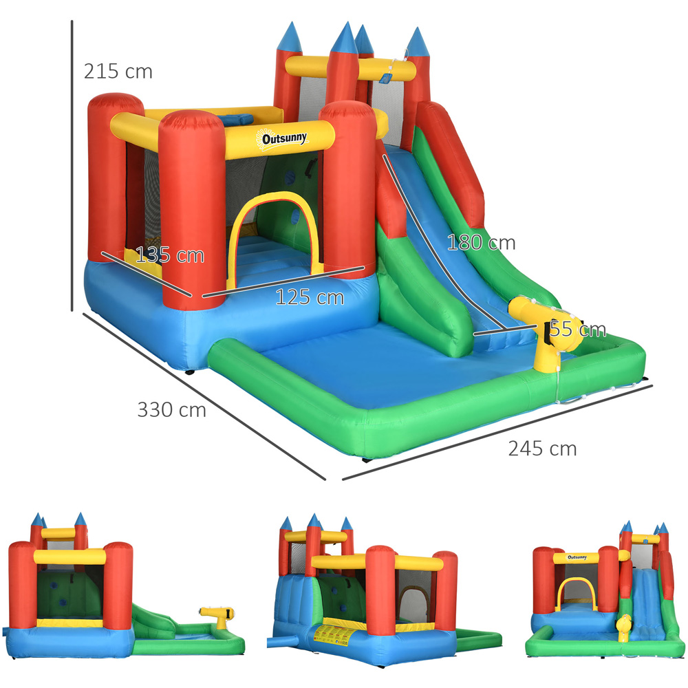 Excite young adventurers with this Outsunny Kids Bouncy Castle with a Water Gun and Blower. With an electric air blower included, you'll have it set up in minutes, ready for hours of entertainment. Ensuring maximum safety, the five ground stakes keep the castle firmly secured to the floor. Spacious and large, this bouncy castle is big enough to fit four children at once and an exciting way to play games with friends. It comes with multiple activities including a trampoline, big slide, water pool, basketball hoop, water gun and climbing wall. Also, the 840D high-density Oxford fabric is weather-resistant. Plus, the inflatable comes with two patches of each colour along with a carry bag for easy transport and repairs.