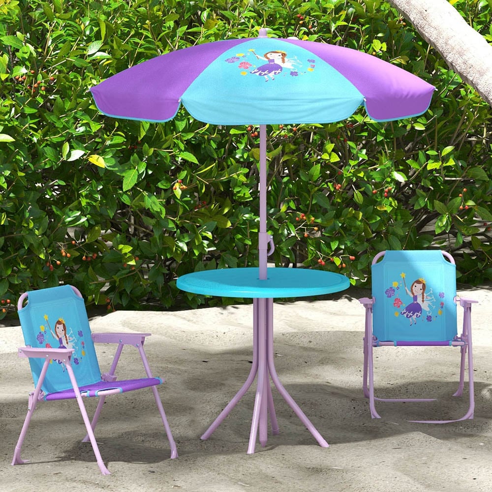 Let your little ones soak up the sun in style with the Outsunny Kids Fairy Garden Table with Parasol. This picnic table comes with two chairs, a table, and a matching parasol. The adjustable parasol shields them from the sun or drizzle. Adorned with a vibrant and playful design, it has a lightweight build makes it easy to store and allows portability.