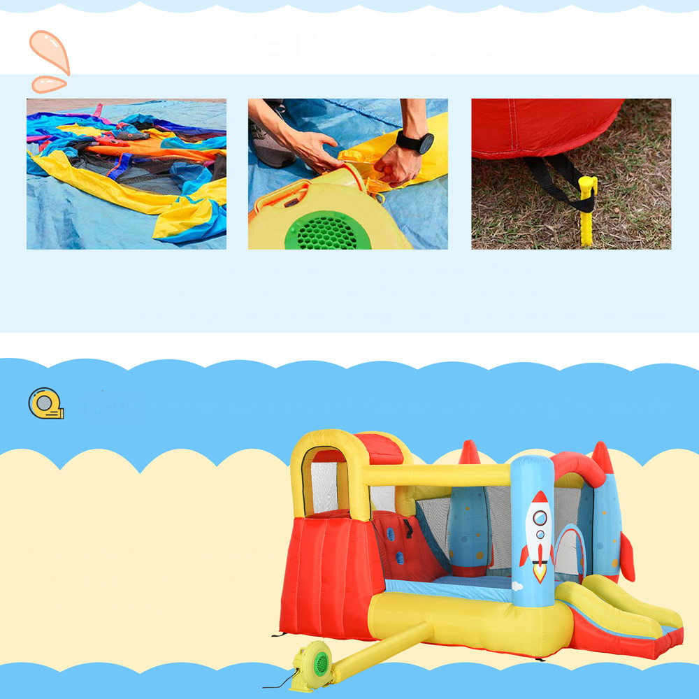 Gift your little ones with the Outsunny Kids Rocket Design Bouncy Castle to experience the ultimate fun. It includes 1 high-quality electric air blower that inflates the whole castle quickly. Safe and secure – it is equipped with 5 ground stakes for better stability; 1 handbag makes it easier to carry; 2 patches of each colour in case of accidents. Made from water-resistant Oxford fabric with a high density of 840D on the jumping area and sliding area – it is big enough to accommodate 4 children at the same time. It consists of 1 trampoline, 2 slides, 1 climbing wall and 1 pool.