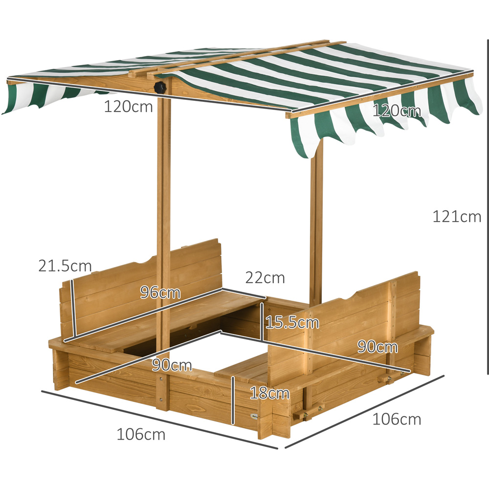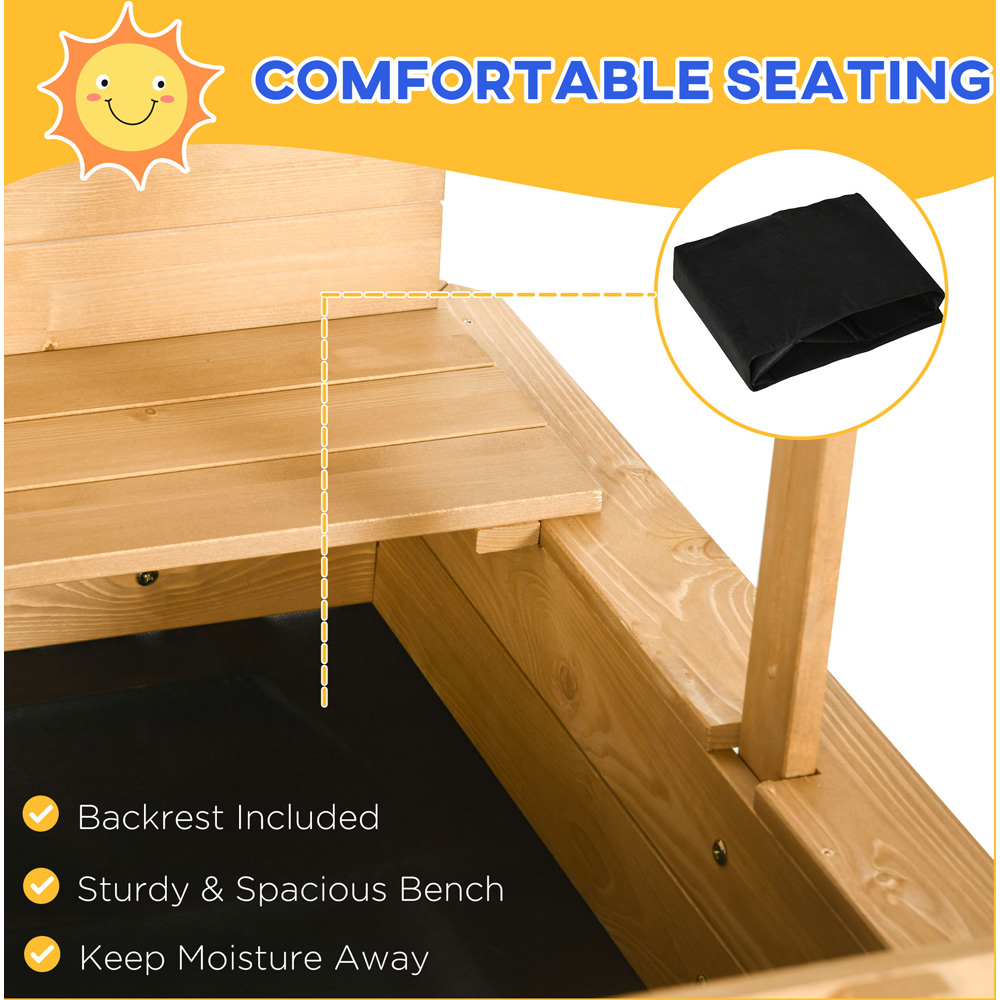 Make playtime interesting with this Outsunny Kids Square Wooden Sandbox Playset. Tough and durable, this large sandpit is made from fir wood for long-term use. It comes with a bench on both ends to give them a place to sit and is spacious enough for several children to dig, build and explore together at once. Covered for sun protection, this sandbox is finished with an overhead canopy to safely shield children from the sun. Moreover, it can hold up to 90 kg of sand.