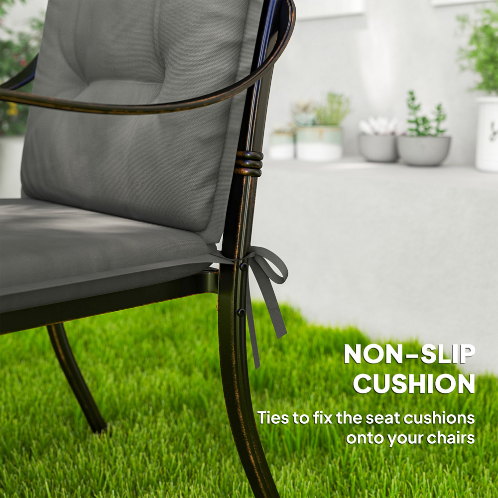 Enhance your outdoor seating experience with Outsunny garden chair cushions with backs. Every cushion has a polyester fabric cover that is smooth on the skin, fade-resistant, and easy to care for. All has high resilience fillings for comfort and relaxation, and ties to secure the pads to your chairs. The tufted backs prevent the filling from shifting. These garden chair cushions add comfort and style to your life.
