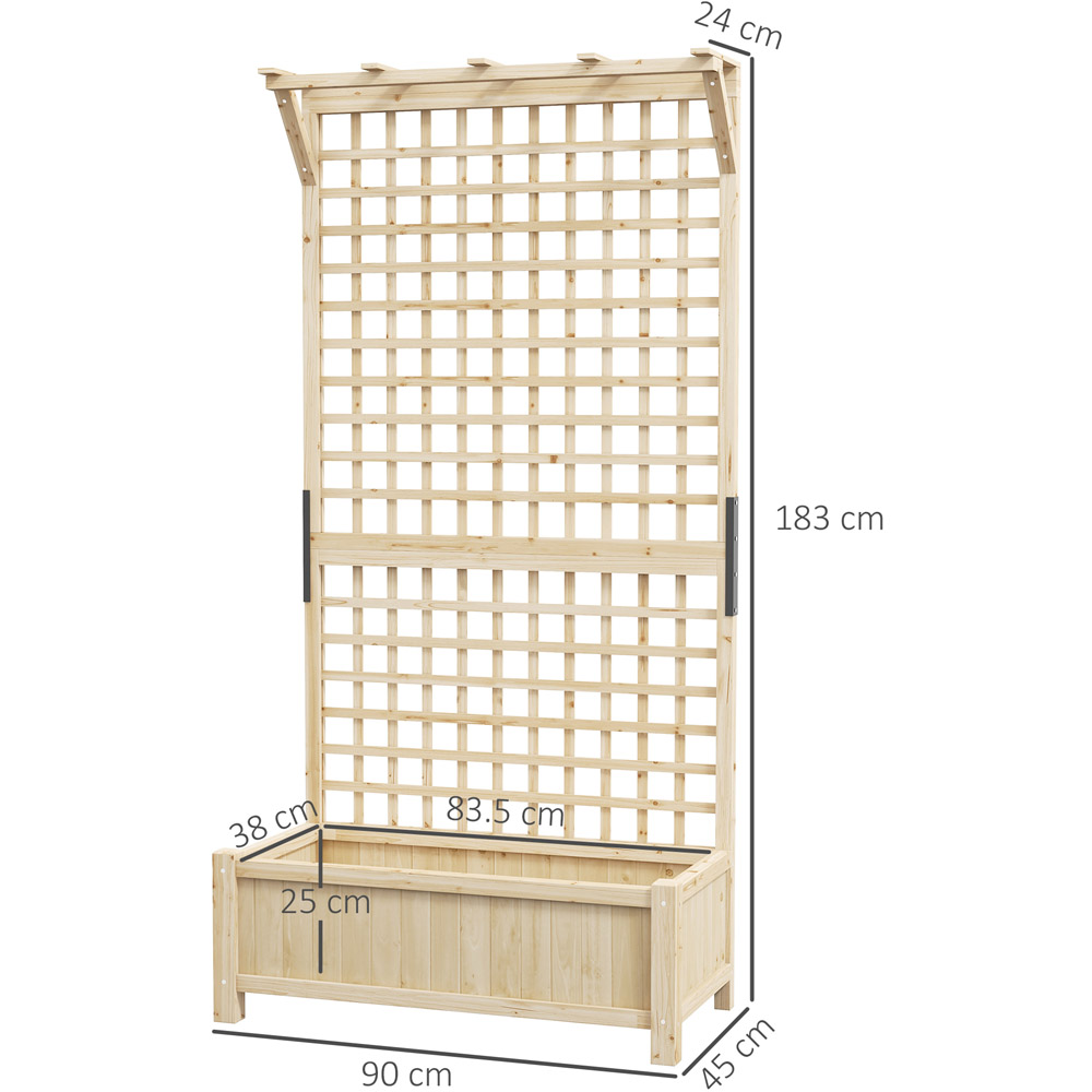 Provide a dedicated growing space in any location with the Outsunny Natural Wood Planter with Trellis for climbing plants. This garden planter goes beyond its primary function by featuring a trellis back and a panelled roof for hanging plants. Crafted from durable fir wood, it is further enhanced with a water-resistant paint coating for added protection. The planter is designed with bottom holes to reduce water build-up, thus preventing damage to the wood. Its two-in-one design combines a garden bed with a trellis, providing a box for plants and flowers along with a gridded back for climbing plants and vines. The hanging roof offers additional space for baskets and pots, expanding the growing area and adding a touch of natural colour. With an inner planter size of 38 x 83.5cm, there is ample room to cultivate a variety of plants, flowers, and vegetables. The elevated design helps keep pests at bay, and the drainage holes prevent water accumulation.