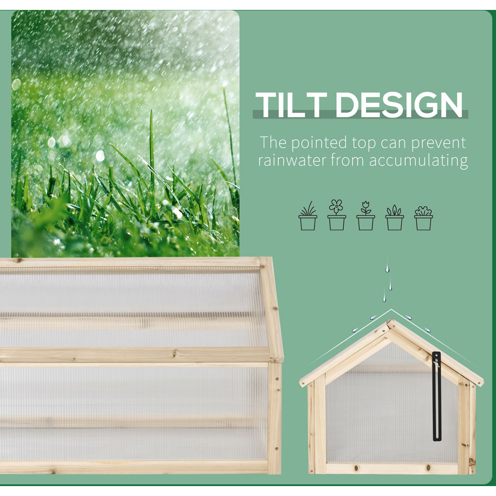 Give your plants and vegetables somewhere to grow healthily with the Outsunny Natural Wooden Polycarbonate 1.6 x 3ft Greenhouse. This mini grow house is made using a wood frame, so it solidly keeps in shape. Fitted with transparent polycarbonate panels, they keep the heat inside whilst the transparency allows the sun to shine through as best as possible. Roof opening provides proper ventilation and easy access to your plants. This small greenhouse will extend the growing season all year round and protect young plants, crops, vegetables and flowers from cold and frost. Allows fresh air inside the cold frame to regulate the temperature easily, and the largest angle is 80°. The sloping design prevents rainwater and other liquids from building up and from entering inside. Add a touch of green to your garden with this simple cold frame design.