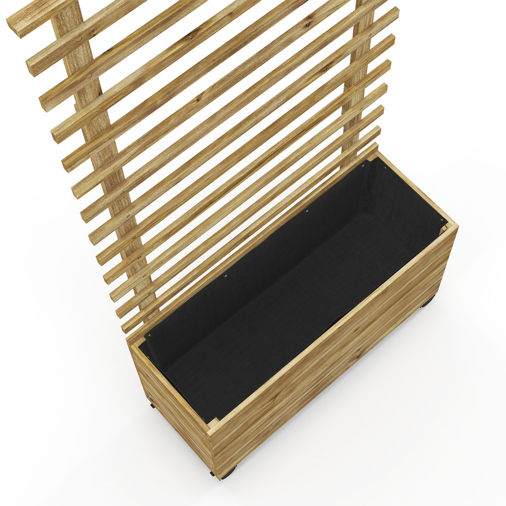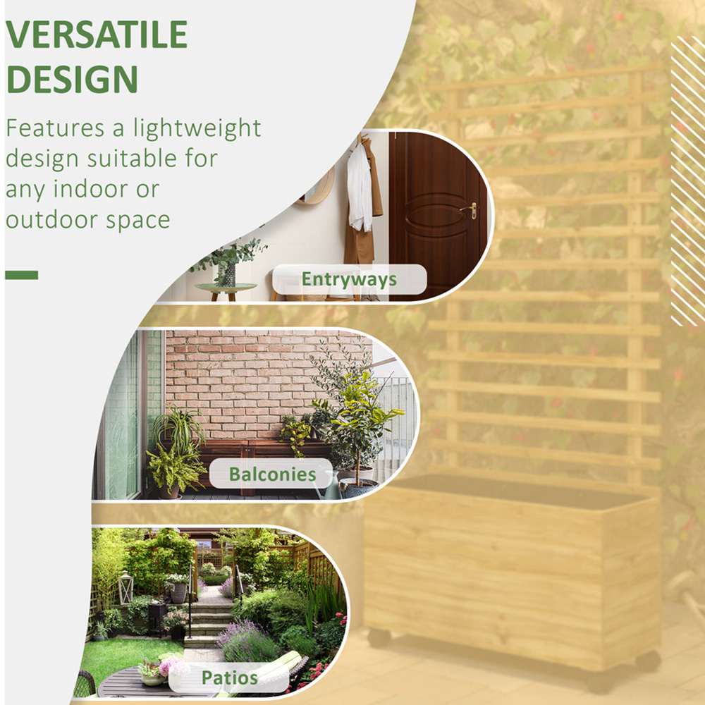 Elevate your green space effortlessly with this Outsunny Natural Wooden Raised Garden Bed Trellis Planter Box. Give plants a beautiful place to grow and flourish with this raised garden bed. With its dual design, it combines a planter box and back trellis to provide a beautiful space for flowers, vegetables, plants, and vines to grow and flourish. The inner fabric bag helps prevent soil from escaping and makes it easy to clean. Plus, you can grow vines and other climbing plants on the trellis or even hang baskets from the side. The planter box is also easy to move around with its four wheels, while two wheels can be locked into place to prevent disturbing the plants inside. Made from fir wood, the structure is strong and coated in varnish for gentle protection outdoors. Size: 76 x 30cm.