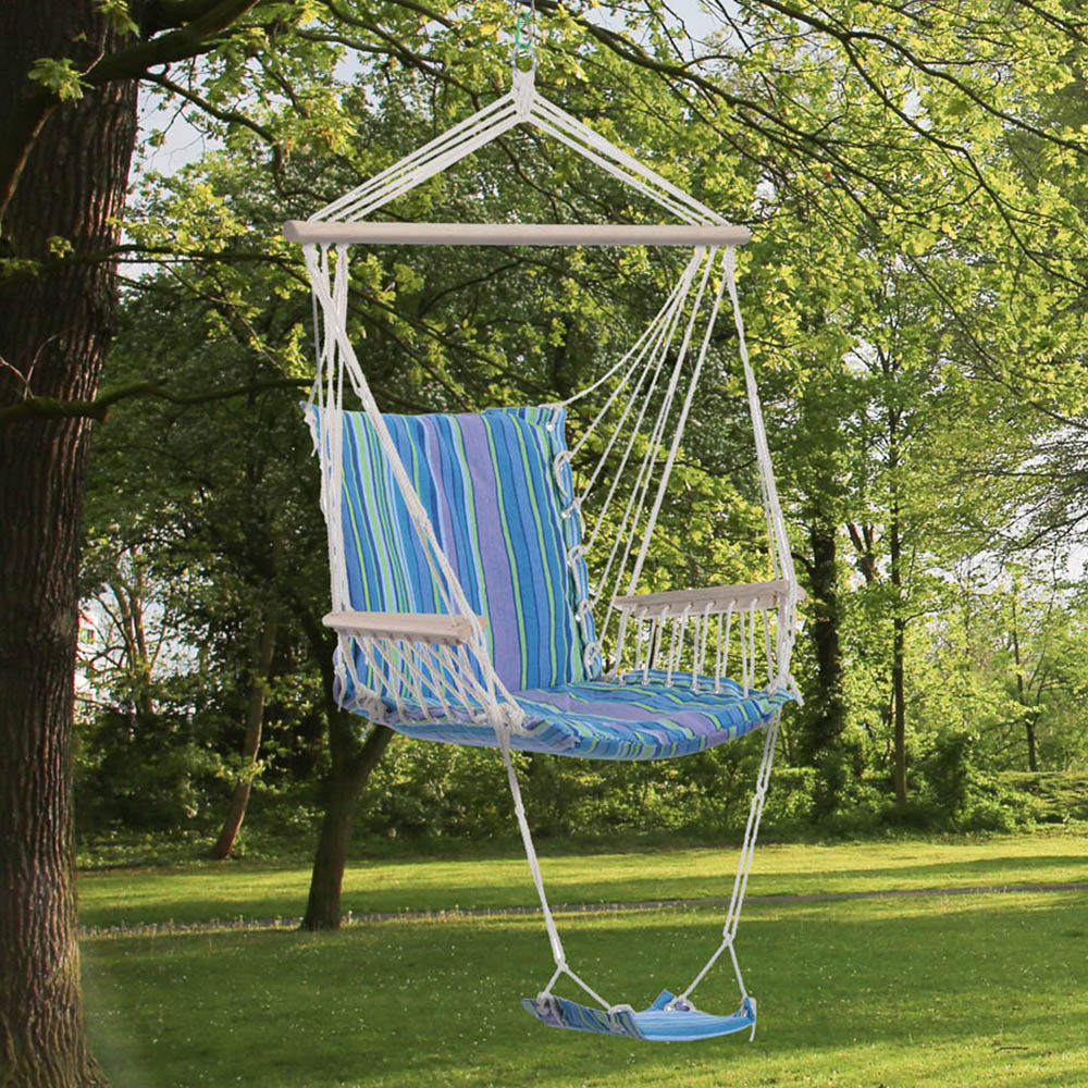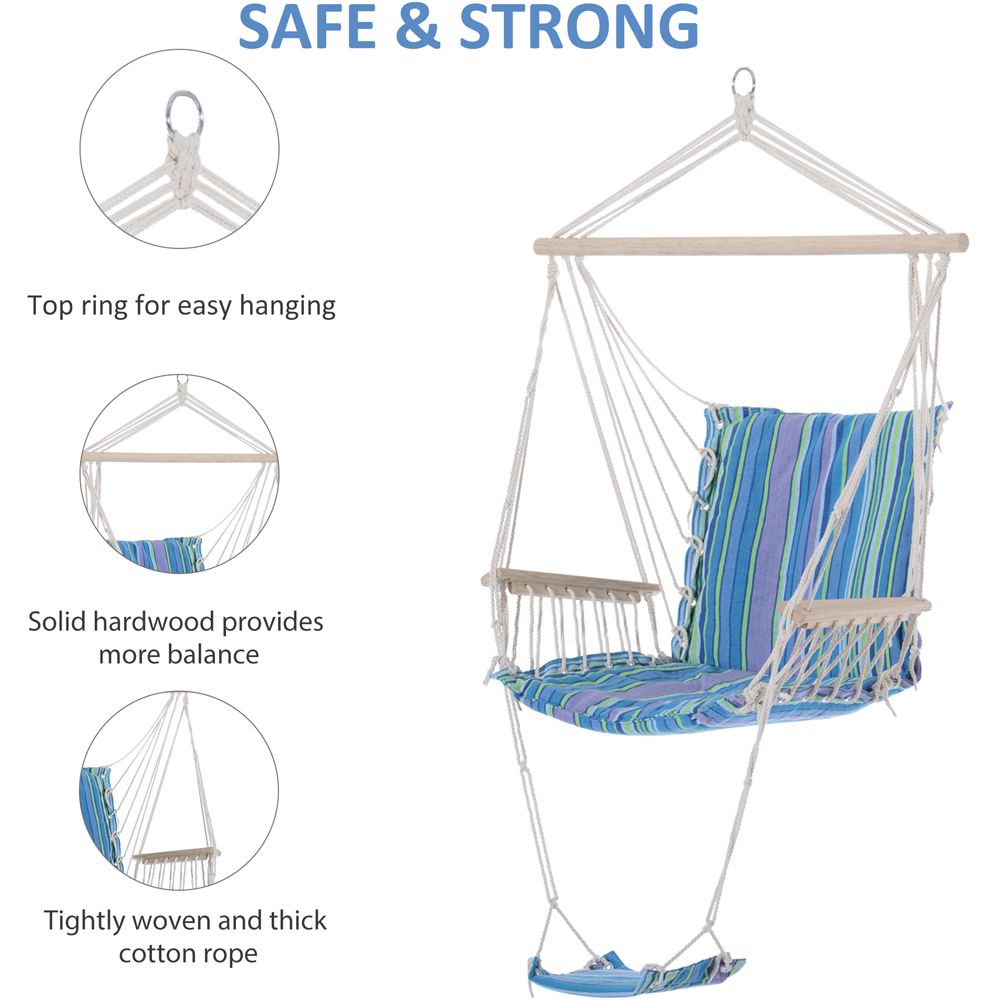 Introduce a cosy retreat to your outdoor living space, whether it be your patio, porch, backyard, or even indoors, with the exquisite garden hammock hanging swing chair by Outsunny. Crafted from natural wood and premium cotton, this swing chair offers unparalleled comfort with its cushioned seat, back support, and footrest. The solid hardwood bar and durable cotton rope ensure superior strength and stability when hanging the swing. With its stylish design and practical features, the hanging chair is the perfect companion for your leisure time. Its unique appearance makes it an ideal addition to gardens, patios, beaches, camping trips, and more. This hanging hammock chair is truly versatile and can transform any space into a serene oasis. Maximum weight capacity: 100kg. Protect your garden furniture with our durable and waterproof covers. Explore our wide range of heavy-duty