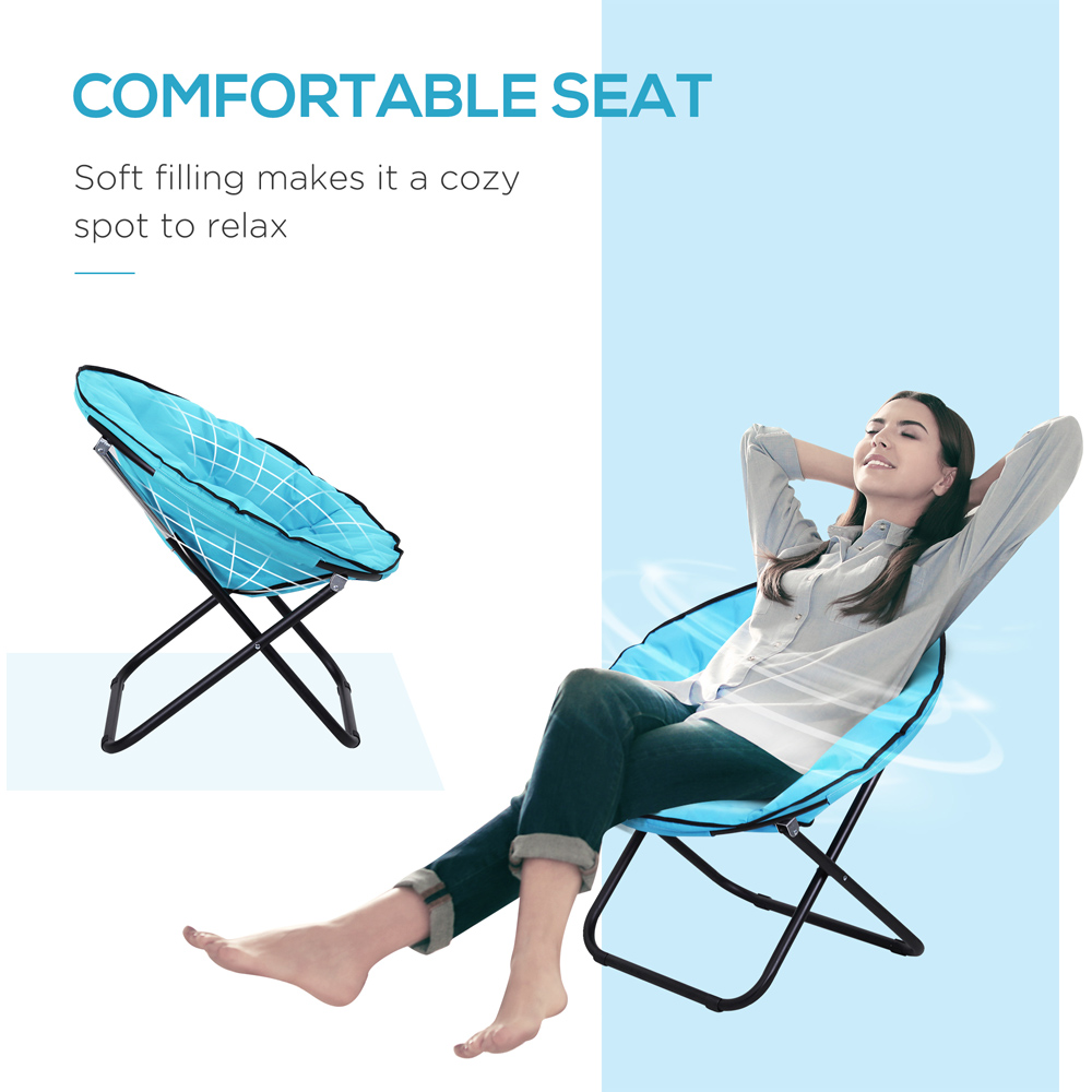 For the perfect seat for your camping trips, balcony, BBQs and other outdoor activities, look to this Moon Chair from Outsunny. Made with a heavy-duty metal frame for sturdiness and durability for years to come, the top features an oversized saucer-shaped cushion. Padded all over, it will offer you hours of endless comfort. Lightweight and foldable, it is easy to take with you, wherever that may be. Fold it up and take it with you easily. Oversized moon shape and padded all over for hours of relaxation. Made from heavy-duty metal to ensure sturdiness and durability for years to come.