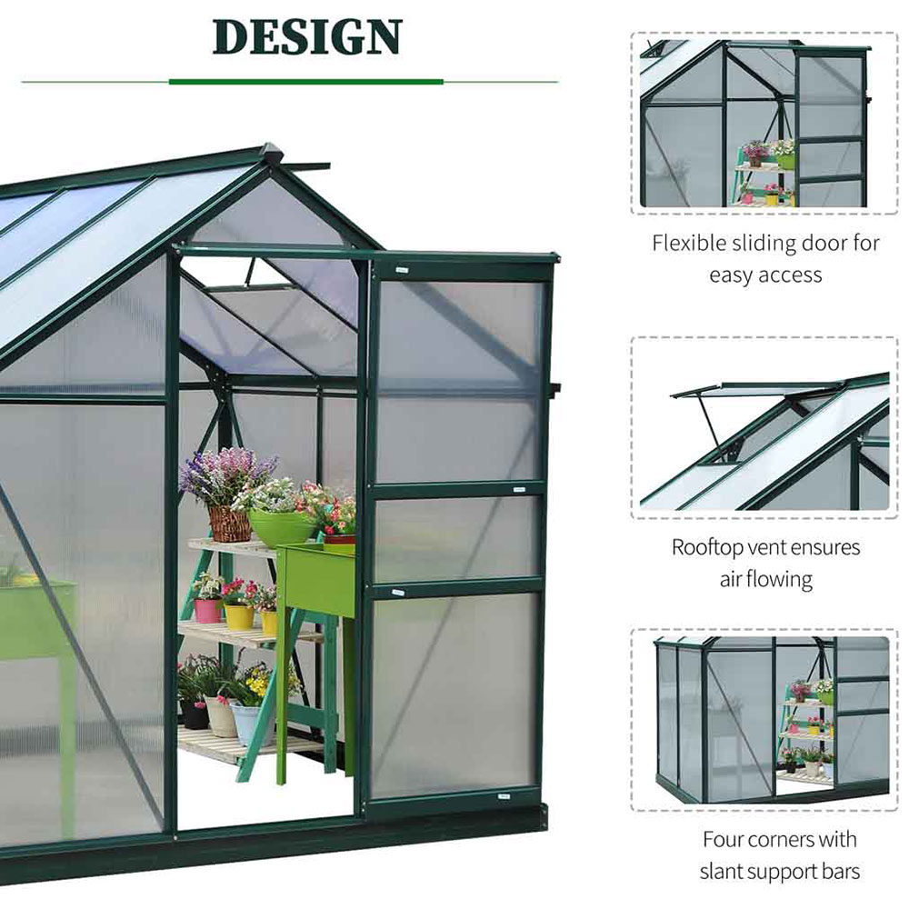 Keep your plants safe with Outsunny Polycarbonate Greenhouse. Perfect for the home gardening enthusiast - the walk-in greenhouse's powder-coated aluminium frame and UV-resistant polycarbonate sheets will keep your plants, vegetables and more safe. The greenhouse's rooftop vent ensures excellent ventilation for your unit. It comes with a strong base to provide this sunroom stability and durability. Four stakes are included to pin into the ground. It also allows natural light to pass through to nurture your plants. Size: 6 x 6ft.