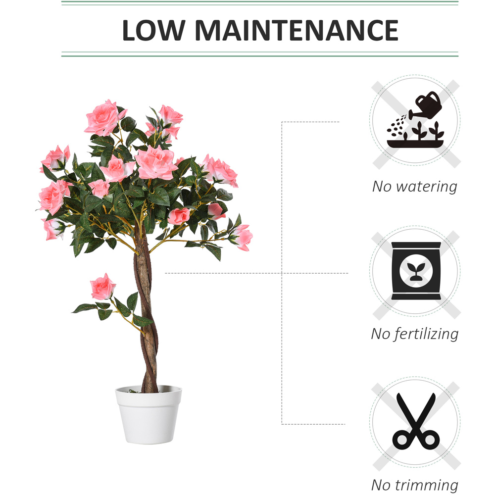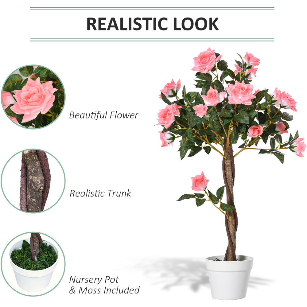 Bring bright and beautiful colours into your home and outdoor areas without the stress of upkeep with this Outsunny Pink Flowers Rose Tree Artificial Plant In Pot. Choose this faux rose plant to breathe life into your space this season and beyond. Made from quality plastic and packed with 350 leaves and 21 flowers, this faux plant is extremely realistic to look at and touch, making it easy to mistake it for a real plant. The indoor plant with a pot, which is filled with grass-looking cement soil to keep the fake tree standing upright all day and night long.